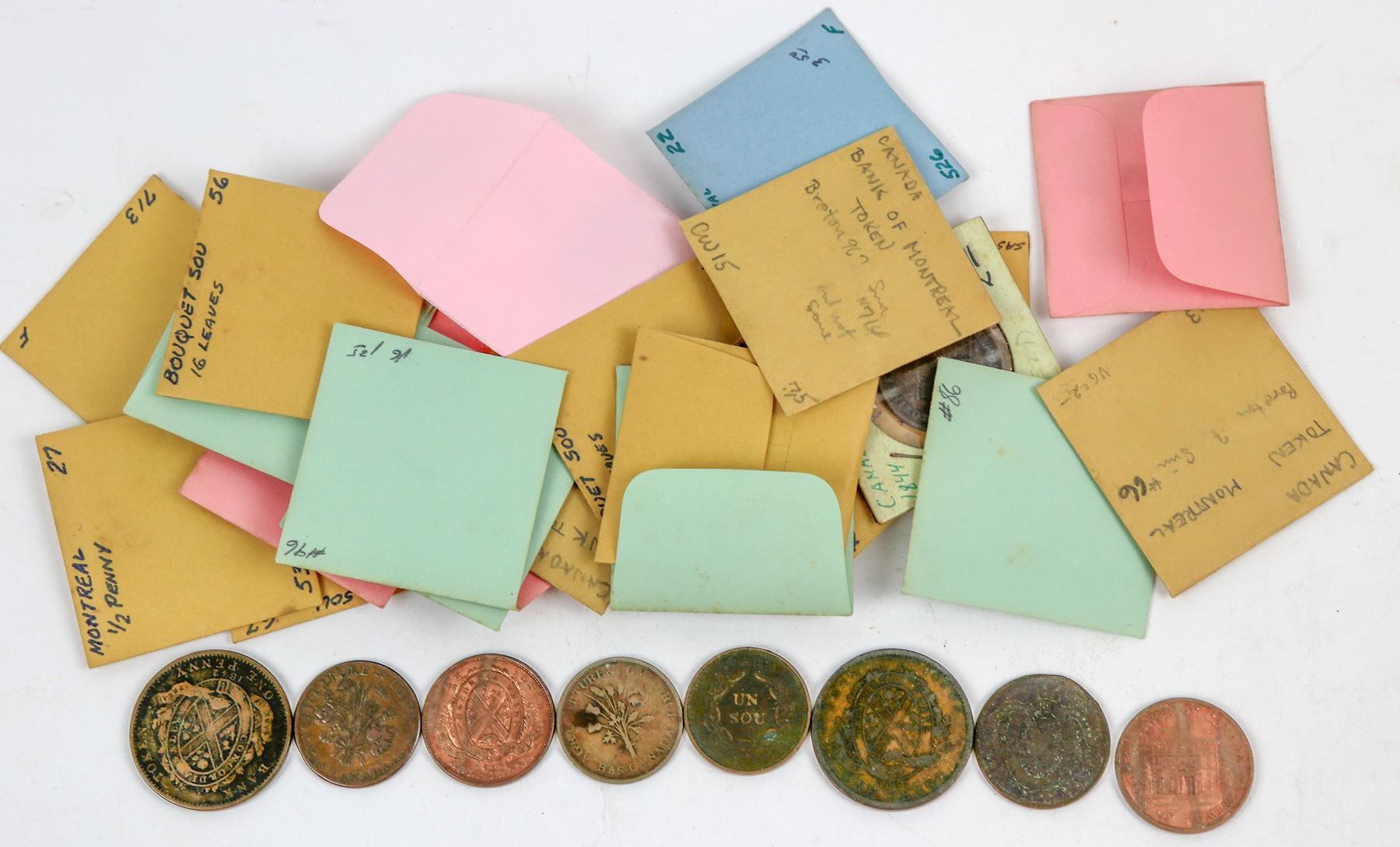 About 35 copper coins from the Bank of Montreal issued in the 1830s-1840s. Bouquet Sou with various numbers of leaves: 16, 18 & 20. Several in AU condition; many fine to very fine. City: State: Date: