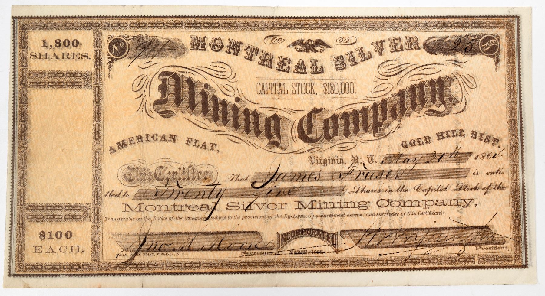 # 94 for 25 shares to James Fraser. Signed by Jonathan Moore and president HN Yerington. Dateline Virginia N. T. 1864. Incorporated March 1864. Location: American Flat, Gold Hill District. Printer was Daily Union Print (Virginia Union Newspaper). Known dates for this newspaper was November 4, 1862 to February 5, 1867. Brown on Brown. Rip at upper center fold edge. Nicks at lower fold edge. Not pretty to look at, but in very nice condition. Listed in Collins with HJS Schell secretary. This is an early Yerington signature. He did not arrive in Nevada until 1863. He quickly made his mark and became the man behind the Virginia & Truckee Railroad a few years later. Biography of Yerington and notes on American City on American Flat.