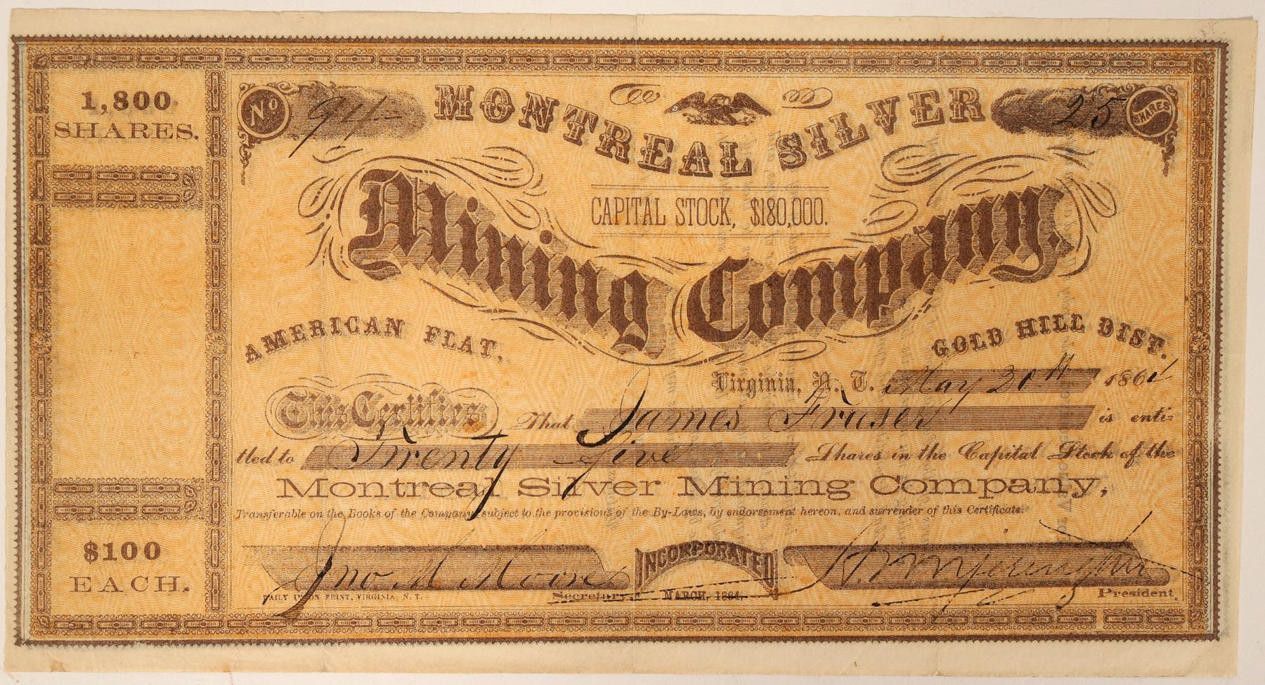 # 94 for 25 shares to James Fraser. Signed by Jonathan Moore and president HN Yerington. Dateline Virginia N. T. 1864. Incorporated March 1864. Location: American Flat, Gold Hill District. Daily Union Print. Known dates for this newspaper was November 4, 1862 to February 5, 1867. Brown on Brown. Rip at upper center fold edge. Nicks at lower fold edge. Not pretty to look at, but in very nice condition. Listed in Collins with HJS Schell secretary. This is an early Yerington signature. He did not arrive in Nevada until 1863. He quickly made his mark and became the man behind the Virginia & Truckee Railroad a few years later. Ken Prag Collection