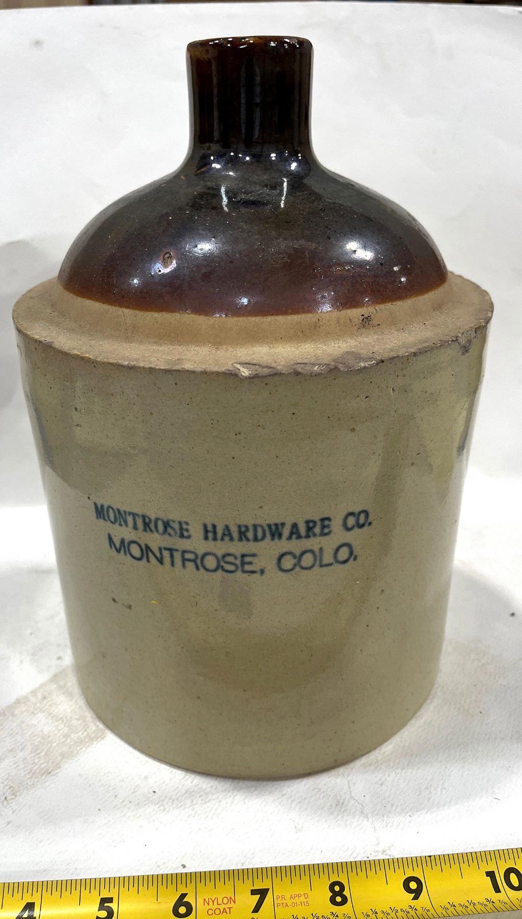 J188 in Preble. Montrose Hardware Co./Montrose, Colo. Brown top. 10.25x7". 1.5 and 2" should chip, lip chip.