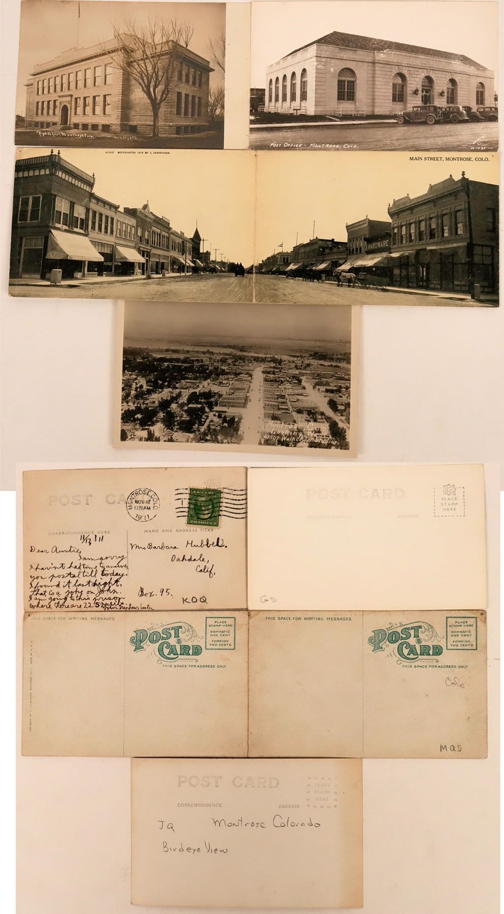 Nice group of cards from Montrose includes real photo cards of the post office, high school, a birdseye and a two part foldout card of main street by J. Luchsinger, 1910.