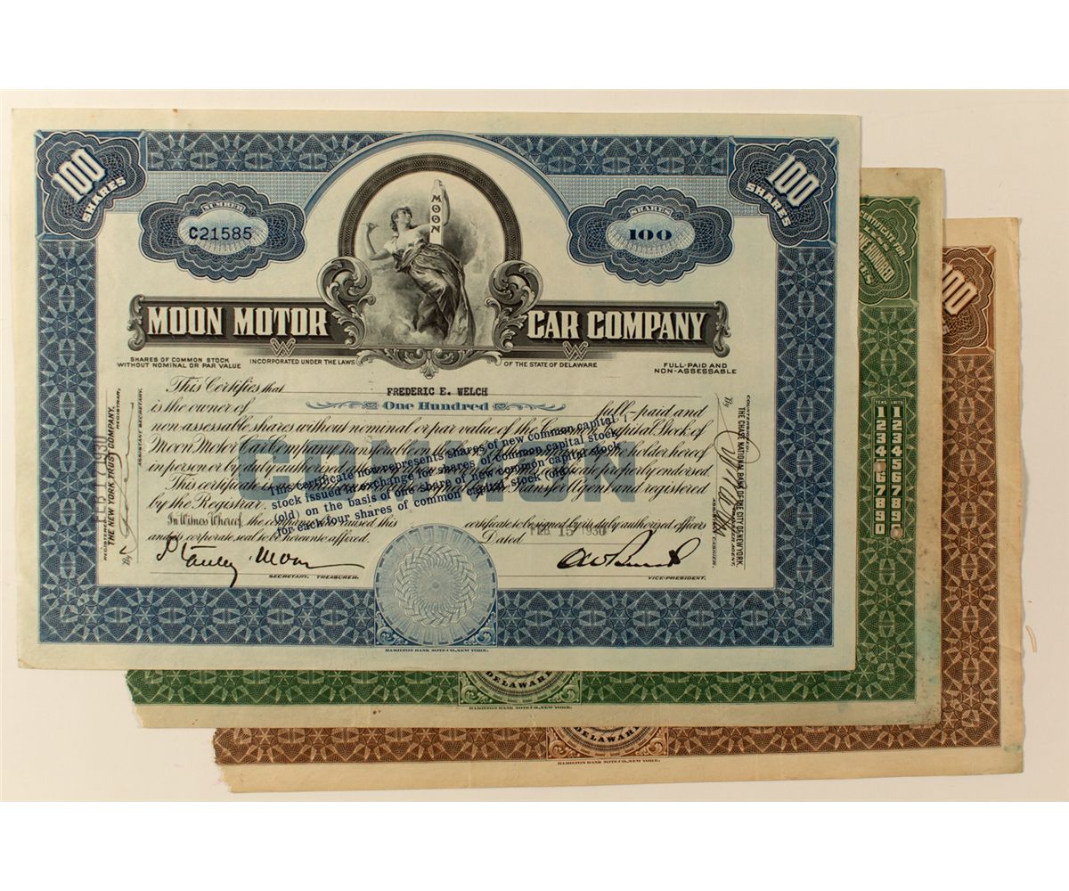3 certs: Blue, Green, Brown. Moon Motor Car Company. Prag Collection
