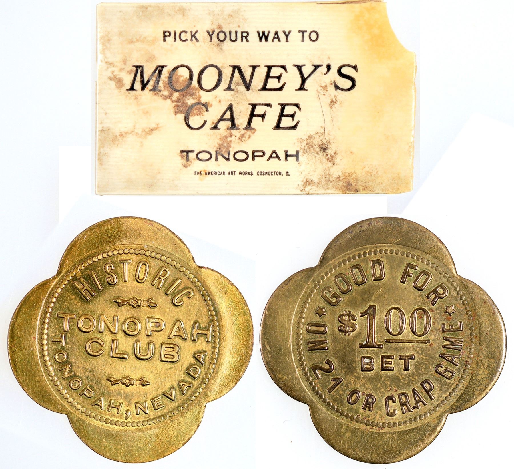 Lot of two Tonopah tokens: 1) HISTORIC / TONOPAH / CLUB / TONOPAH, NEVADA // GOOD FOR / $1.00 / BET / ON 21 OR CRAP GAME; Br., Sc 4, 39 mm. 2) Pick Your Way To / Mooney's Cafe / Tonopah // (blank); celluloid, 49 x 30 mm, upper right corner chipped.(unlisted in tokencatalog). Ex Holabird sale 2008. Nevada Tonopah
