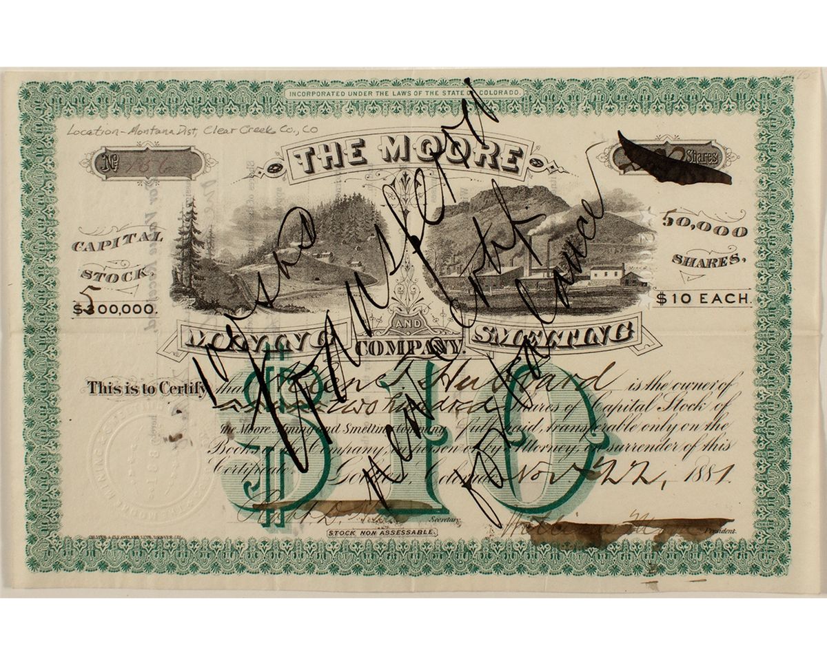 Inc. in Colorado in 1880. No. 156. Ink and punch cancelled. Issued for 200 shares to Allen Hubbard on Nov. 22, 1887 in Golden, Colorado. Signed by president and secretary, but names have been inked over. Company seal at lower left. Reverse has signatures to transfer 100 shares Mrs. C.W. Pratt. Two vignettes at top center show mine and smelting buildings and mountain scenes. Measures 7" x 10 ½." Condition: folds and ink smears. The company was the collaboration of Francis Everett, Col. William Moore, and Prof. Gregory Board, and consisted of Board's smelting business and the Murray Mine at Lawson in Clear Creek County [ref: History of Clear Creek and Boulder Valleys, Colorado…, pg. 563, 1880].City: GoldenCounty: JeffersonState: CODate: