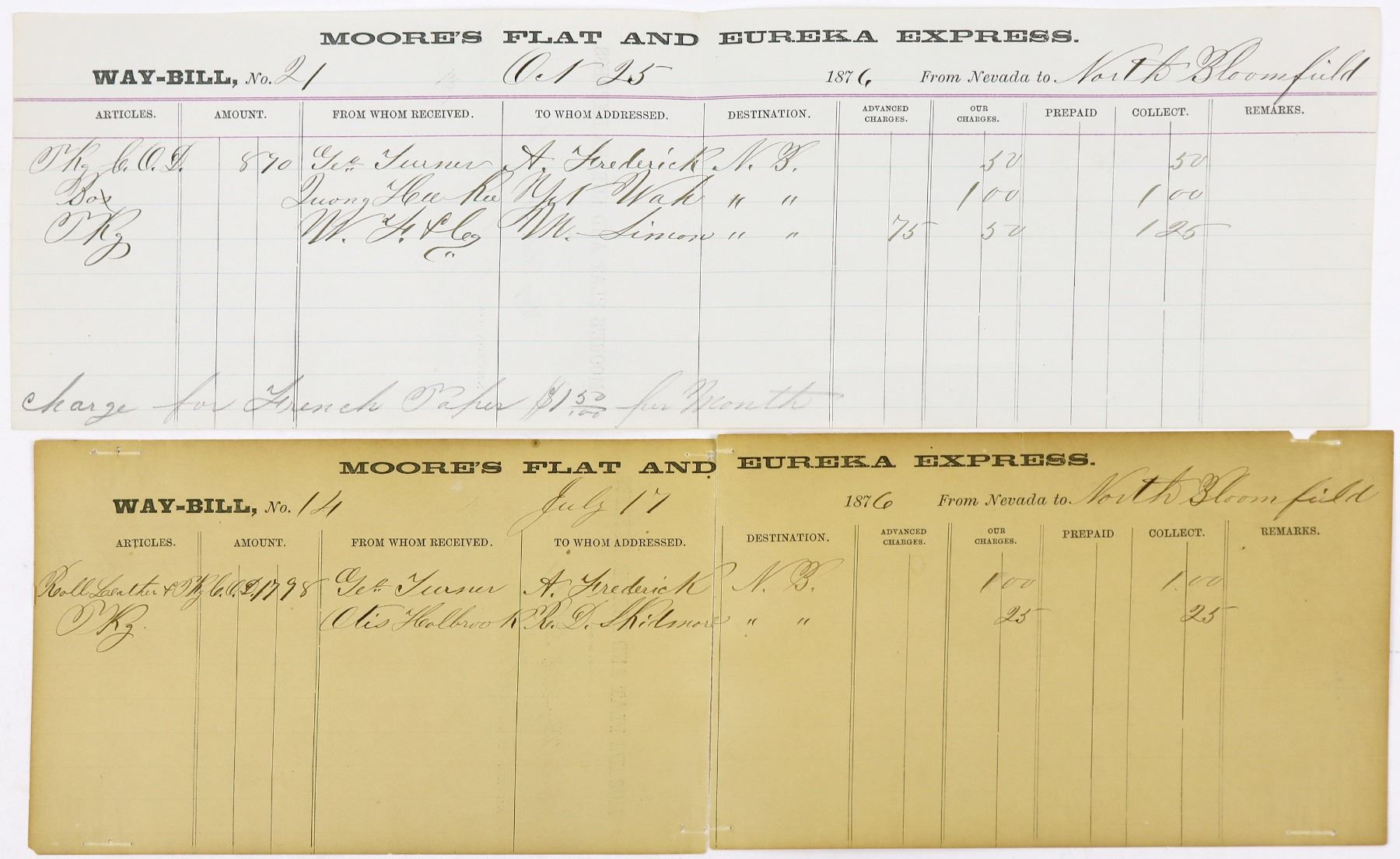 Lot of 2 way-bills for transport of packages from Nevada (City) to North Bloomfield in 1876. 4 x 14" One way-bill is in very good condition. The other is heavily toned and tape repaired split. Nevada County California 1876