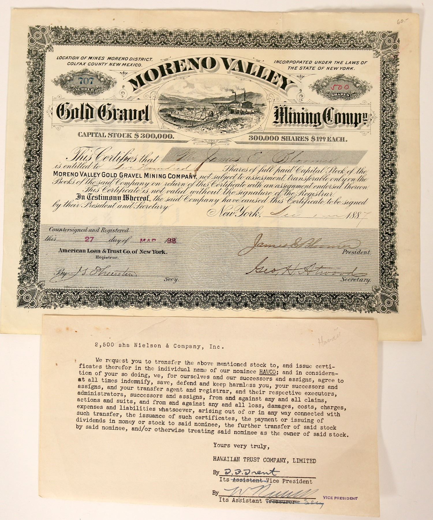 # 707 for 500 shares to James Bloomer. Signed by G Thursten, president James Bloomer and George Atwood. Dateline New York 1888. Incorporated in 1883. Not cancelled. Complex mill scene vignette. J Ottman of New York printer. Pin holes upper border. dog ear upper right, heavy folds. etc. Ken Prag Collection