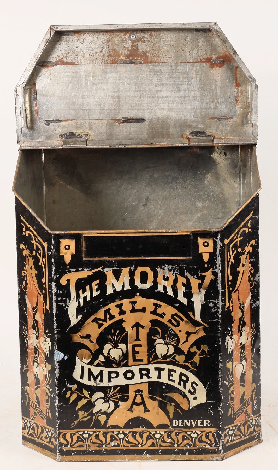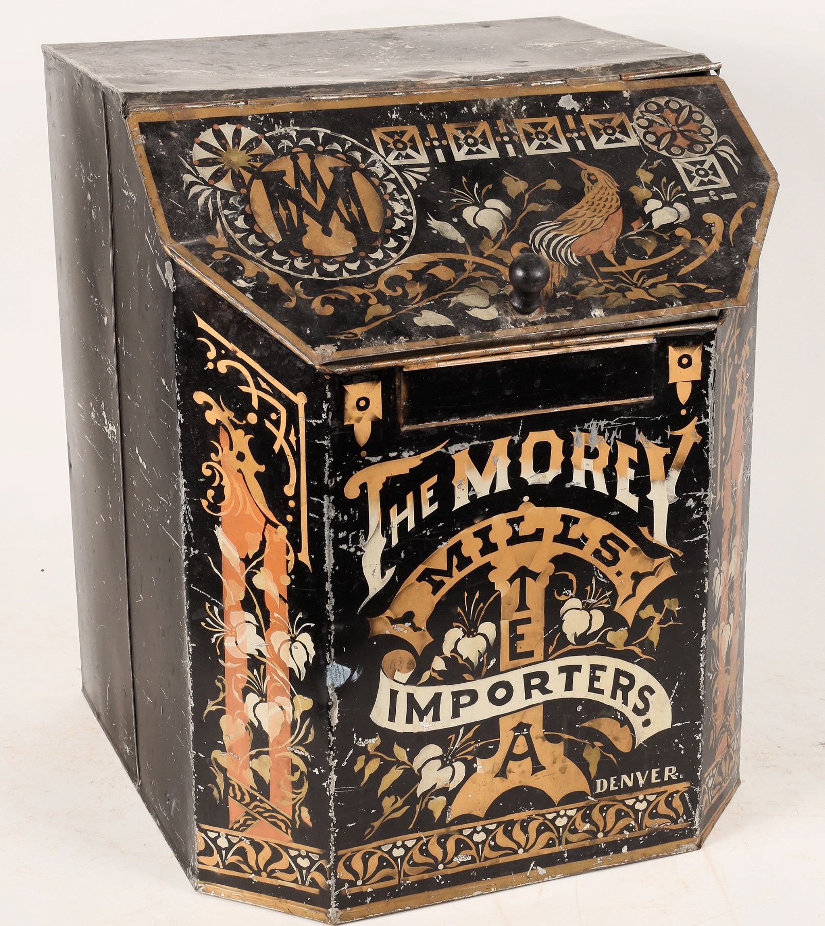 Nice, The Morey Mills Tea Importers retail dispensing cabinet with hinged lid and fancy design. 18x14.5x16", some paint loss, mainly on sides, top and back. Gary Bracken Collection