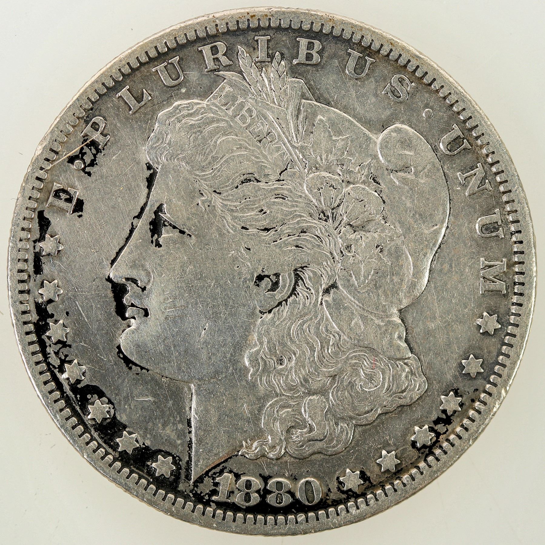 NGC wouldn't slab it, but it's a Carson City Morgan by golly. Traces of black might mean it was painted at one time, and someone tried to fix it. Overall G-VG details; some more conservation might improve the appearance, but it's a coin used the formative years of the Carson City West.