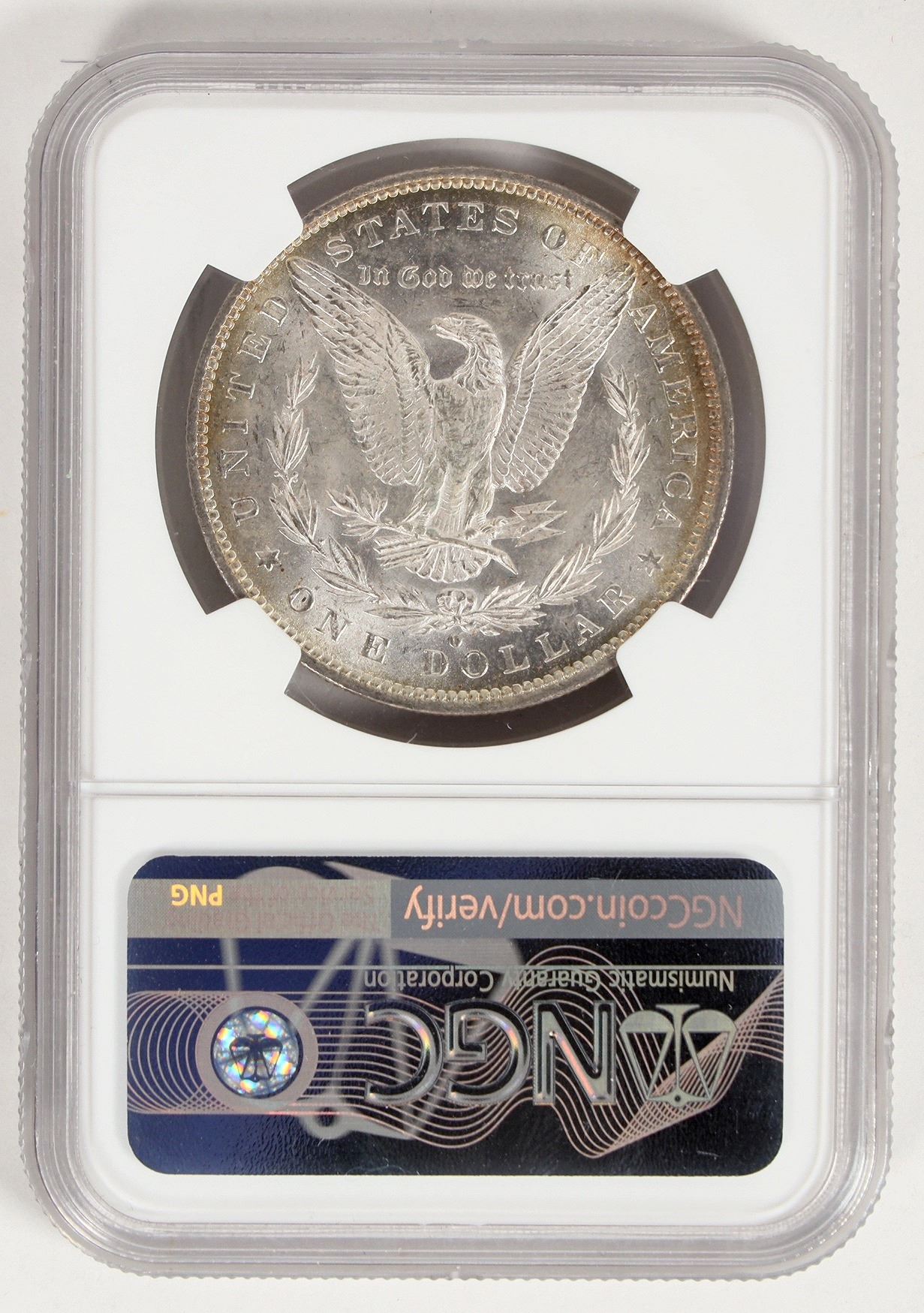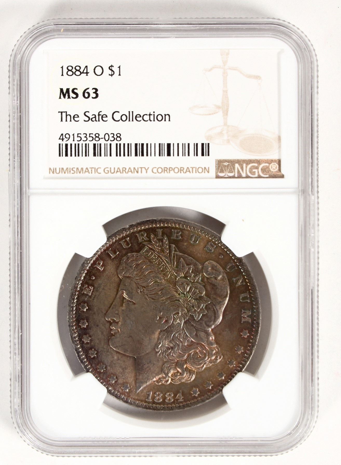 NGC graded MS 63 1884-O Morgan dollar with green and purple highlighted letters and hair highlights on obverse, against a light grey background with purple halo around Lady Liberty; frosty white reverse with orange silhouetted United States of America.