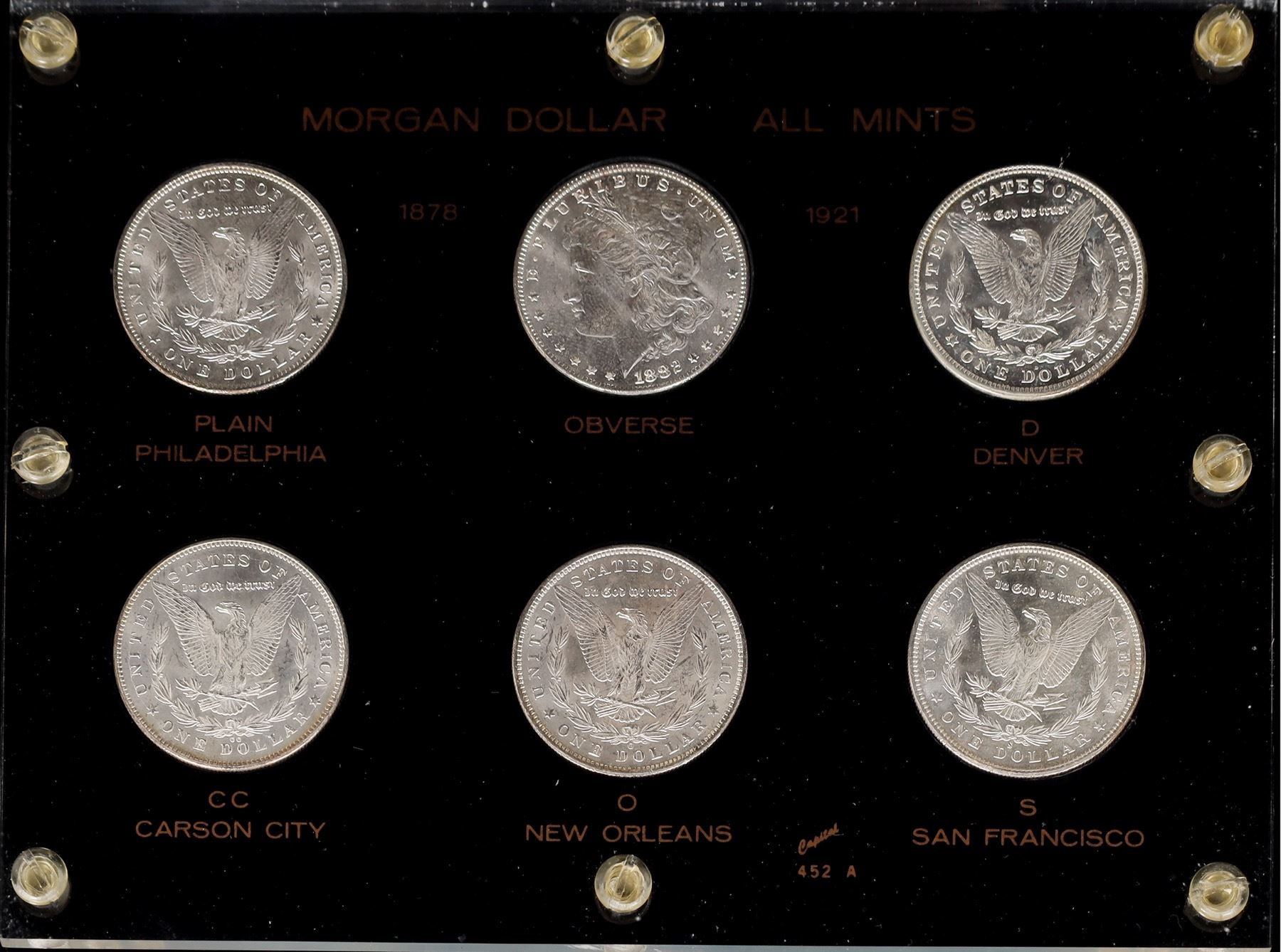 Capitol plastics number 452 A: Morgan Dollar All Mints holds six Morgan dollars in an 8 x 6 inch case. Plain Philadelphia, Obverse, "D" Denver, "CC" Carson City, "O" New Orleans, "S" San Francisco. Dates are: 1882 (2); 1921-D (small carbon spot); 1878-CC; 1885-O; 1880-S. All coins are Brilliant Uncirculated condition.