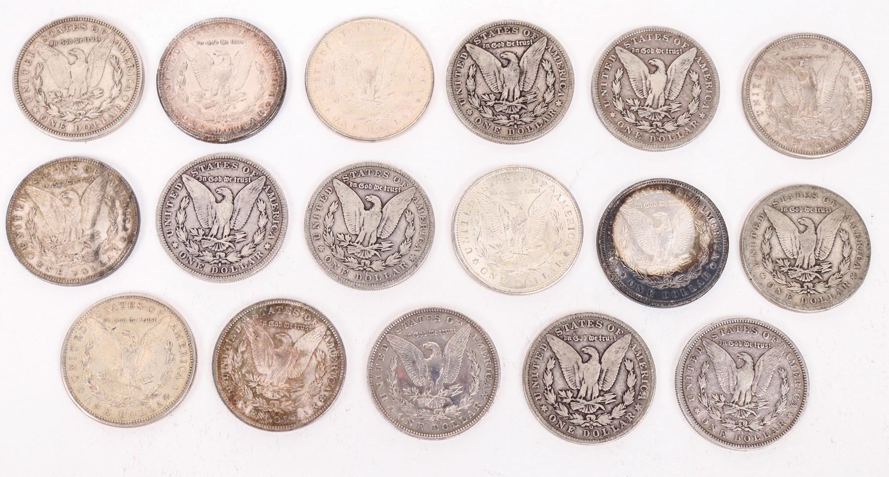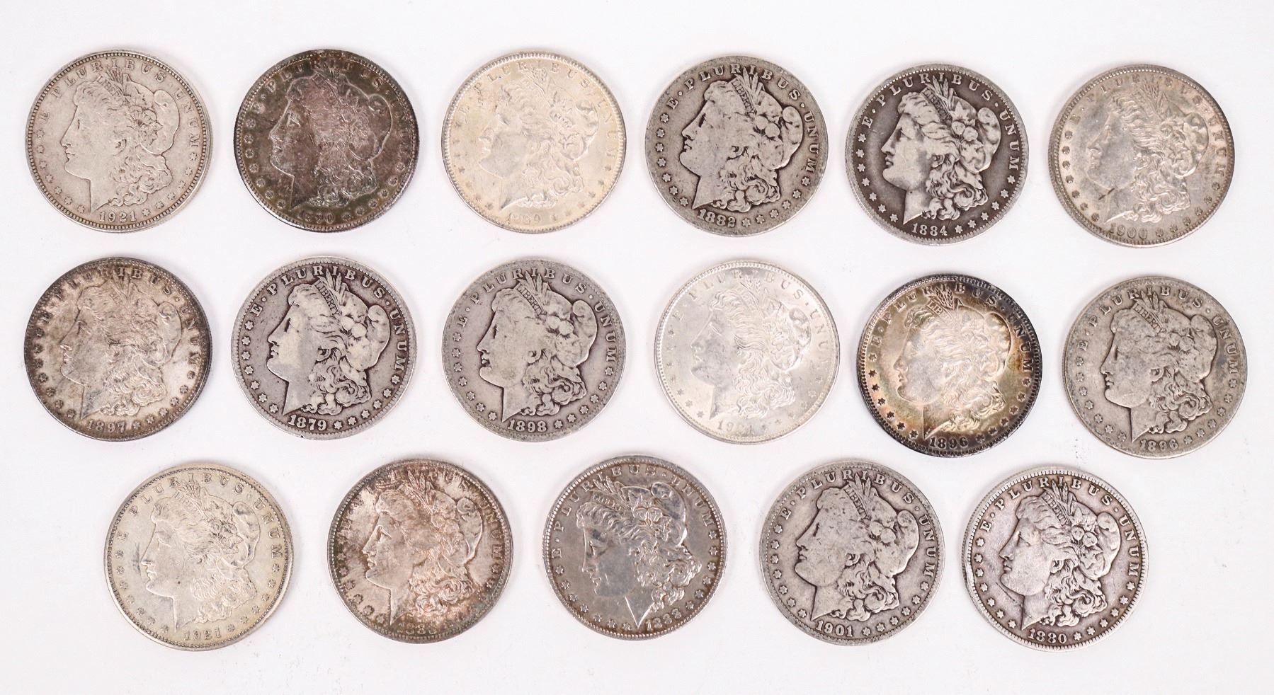 Seventeen different date Morgan dollars: 1879-S; 1880-S; 1882-S; 1883-O; 1884-O; 1888-O; 1889; 1890-S; 1896; 1896-S; 1897; 1898-S; 1900; 1901-O; 1921; 1921-D; 1921-S. Some VG-F, some XF-AU. Nice group.