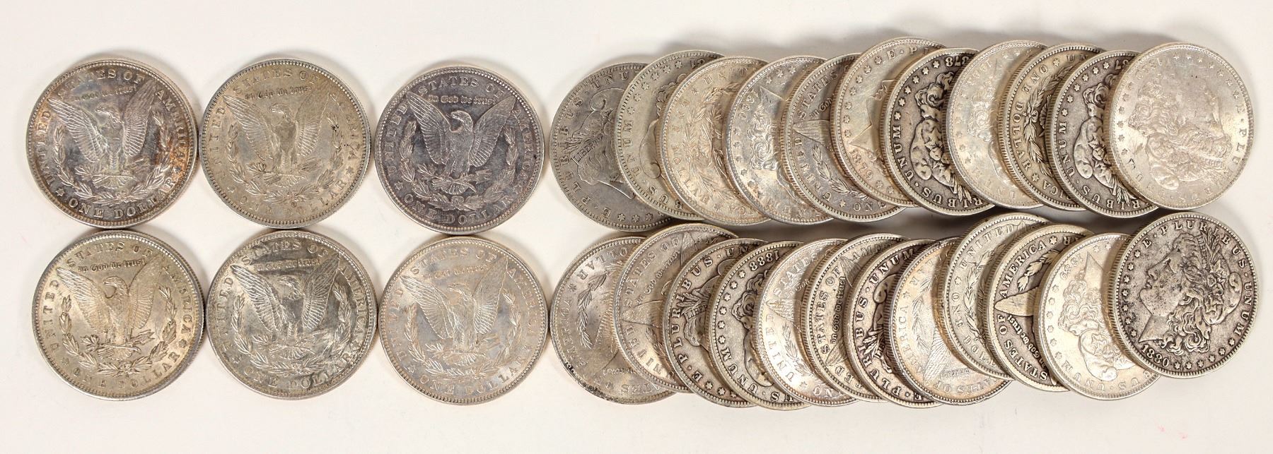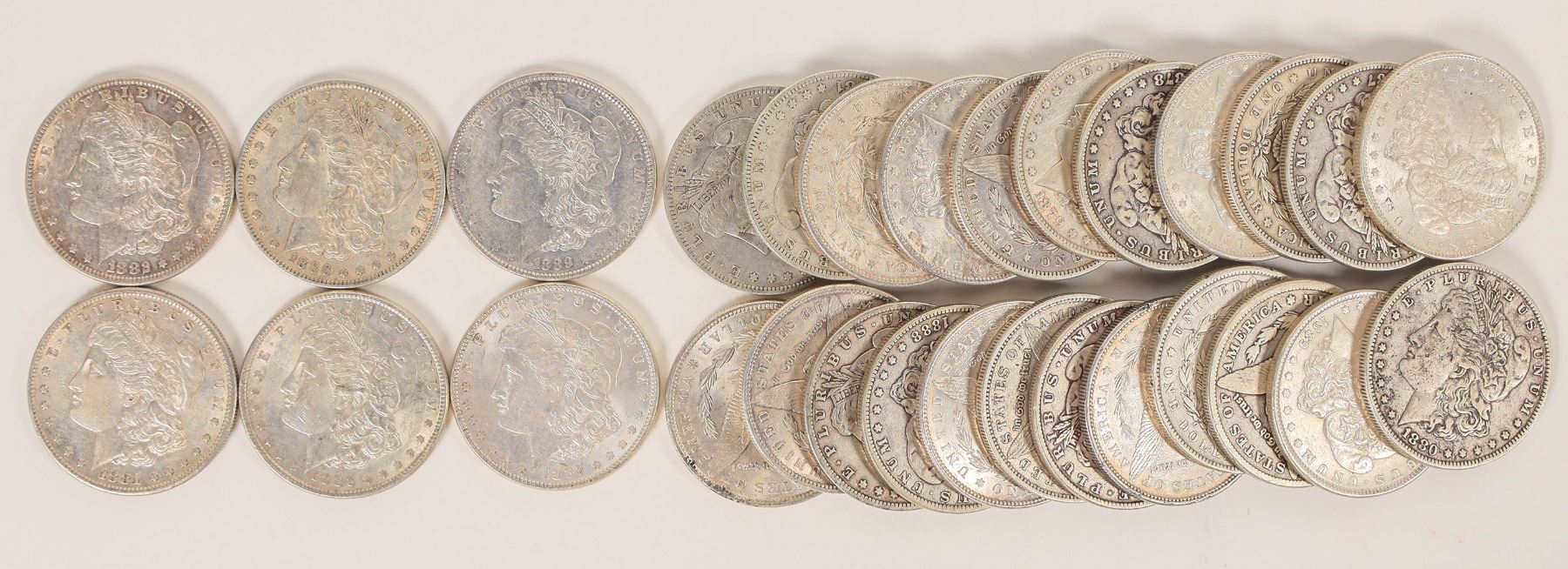 Twenty nine Morgan dollars with different dates: 1878; 1878-S; 1879 (VF-XF); 1879-S (EF-AU); 1880; 1880-O (AU); 1881; 1881-S (AU); 1882 (EF); 1882-CC (VG-F); 1884; 1885 (AU); 1886 (AU); 1886-O (EF); 1887 (AU); 1887-O (AU); 1888-O; 1889 (AU); 1889-O (VF); 1890 (AU); 1890-O (VF); 1894-O (EF); 1896 (AU); 1897-S (VF); 1898 (UNC); 1899 (EF-AU); 1899-O; 1900 (AU); 1903 (Unc).