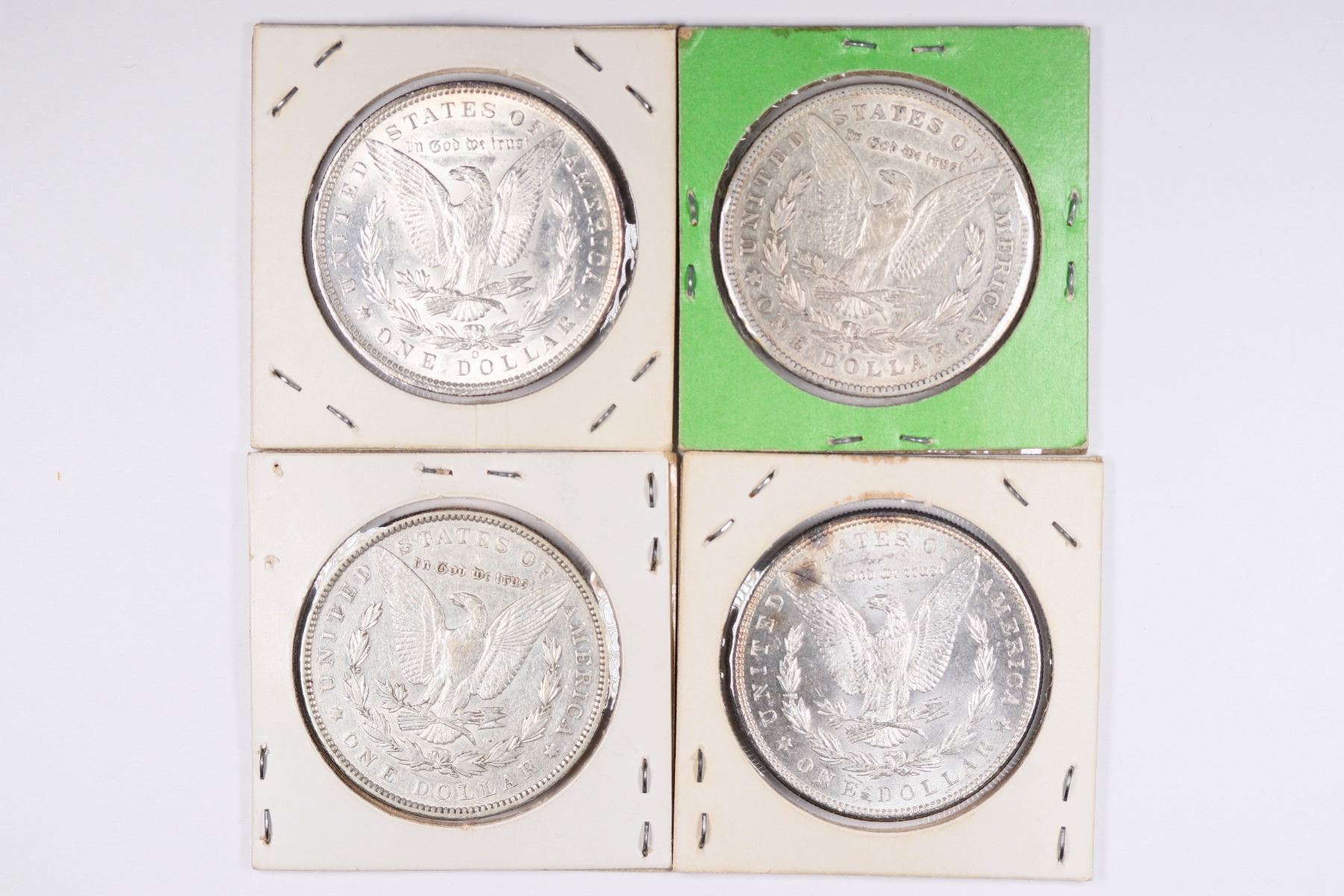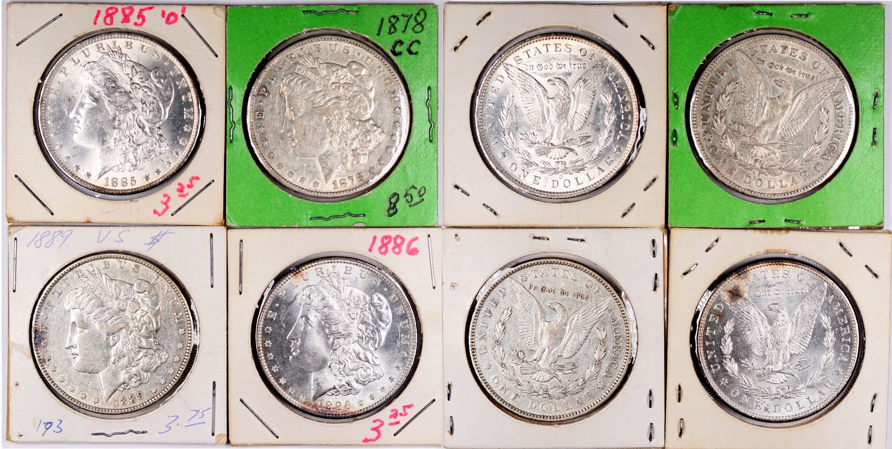 Lot of four Morgan Dollars: 1878-CC, EF condition; 1885-O, AU; 1886, BU w/carbon spots; 1889, VF w/carbon spots.