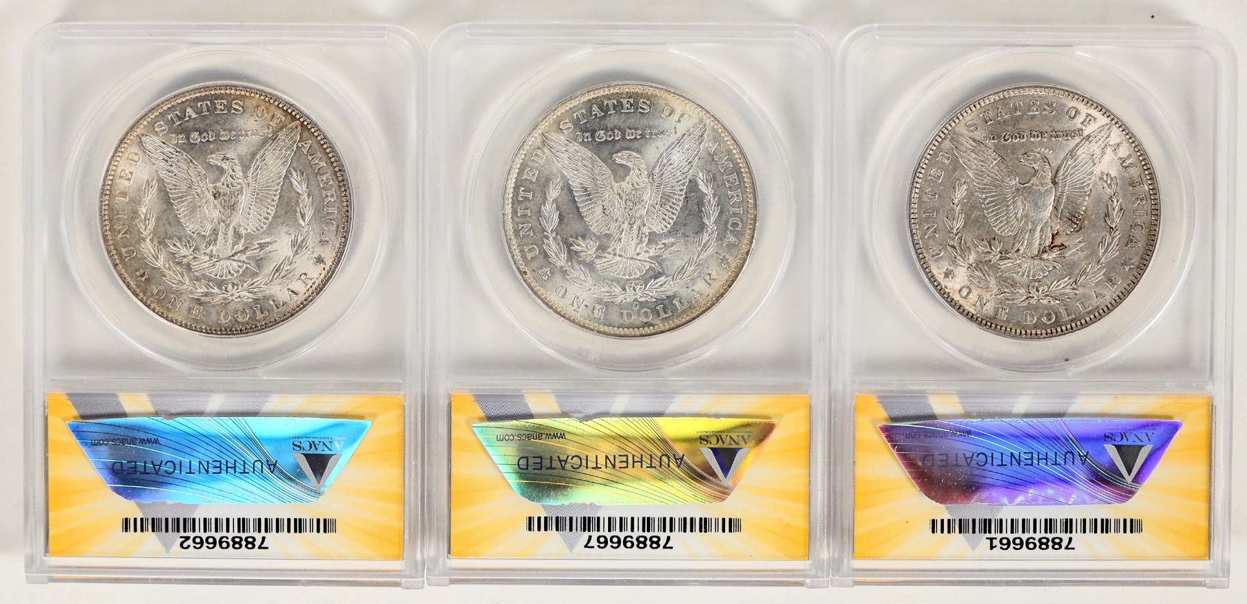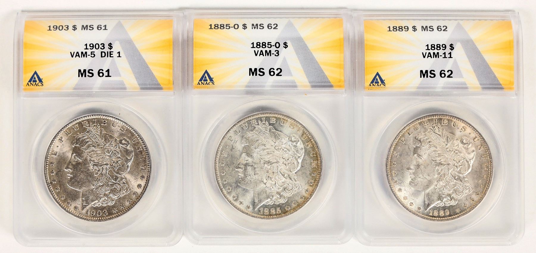 Three ANACS graded Morgan dollars with different VAM varieties: 1) 1885-O MS 62; VAM-3. 2) 1889 MS 62; VAM-11. 3) 1903 MS 61; VAM-5 die 1.