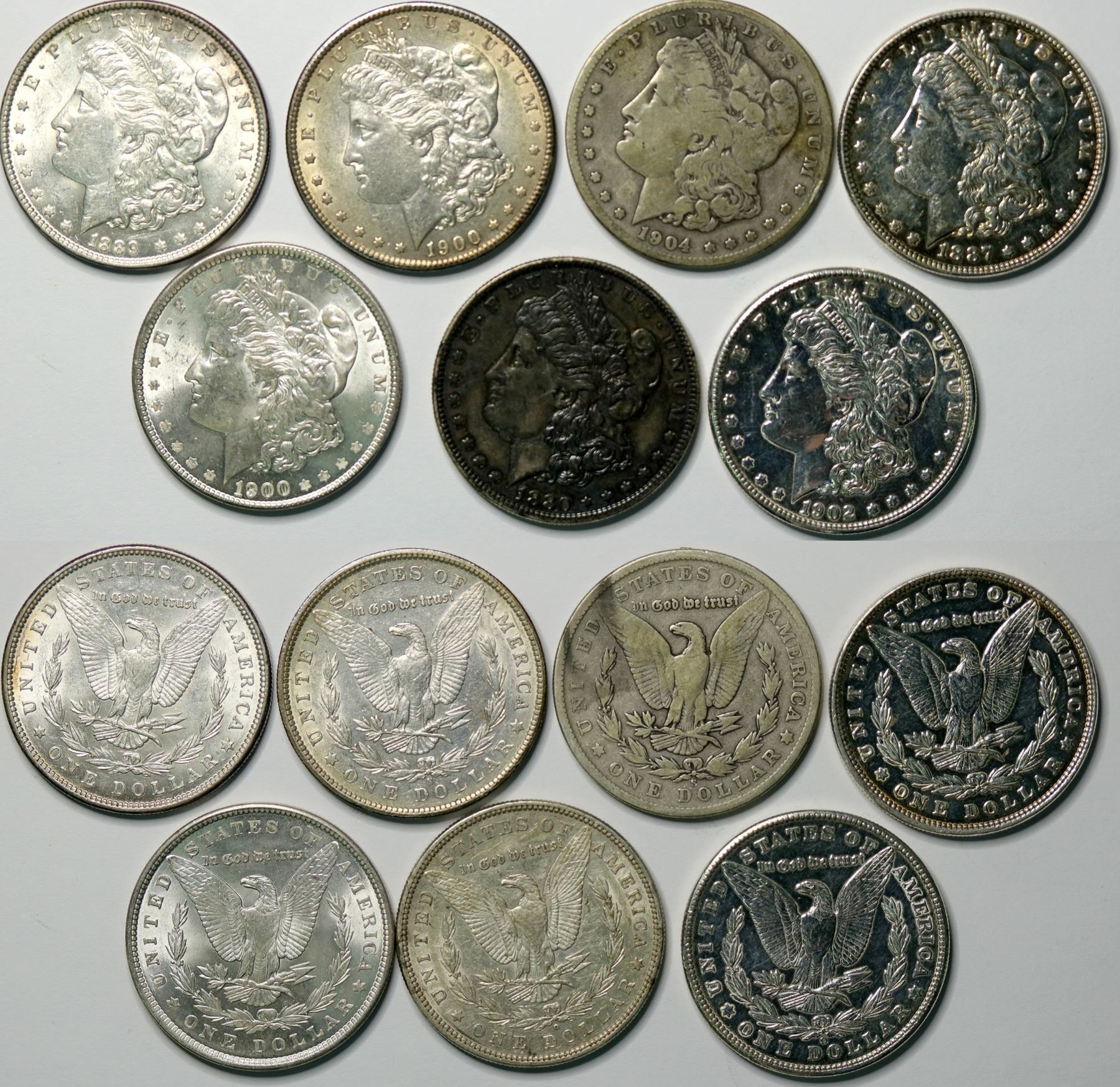 Seven Morgan dollars: 1889 unc; 1900 unc; 1900s circ, 1880o circ, 1904s circ, 1887 and 1902 polished.