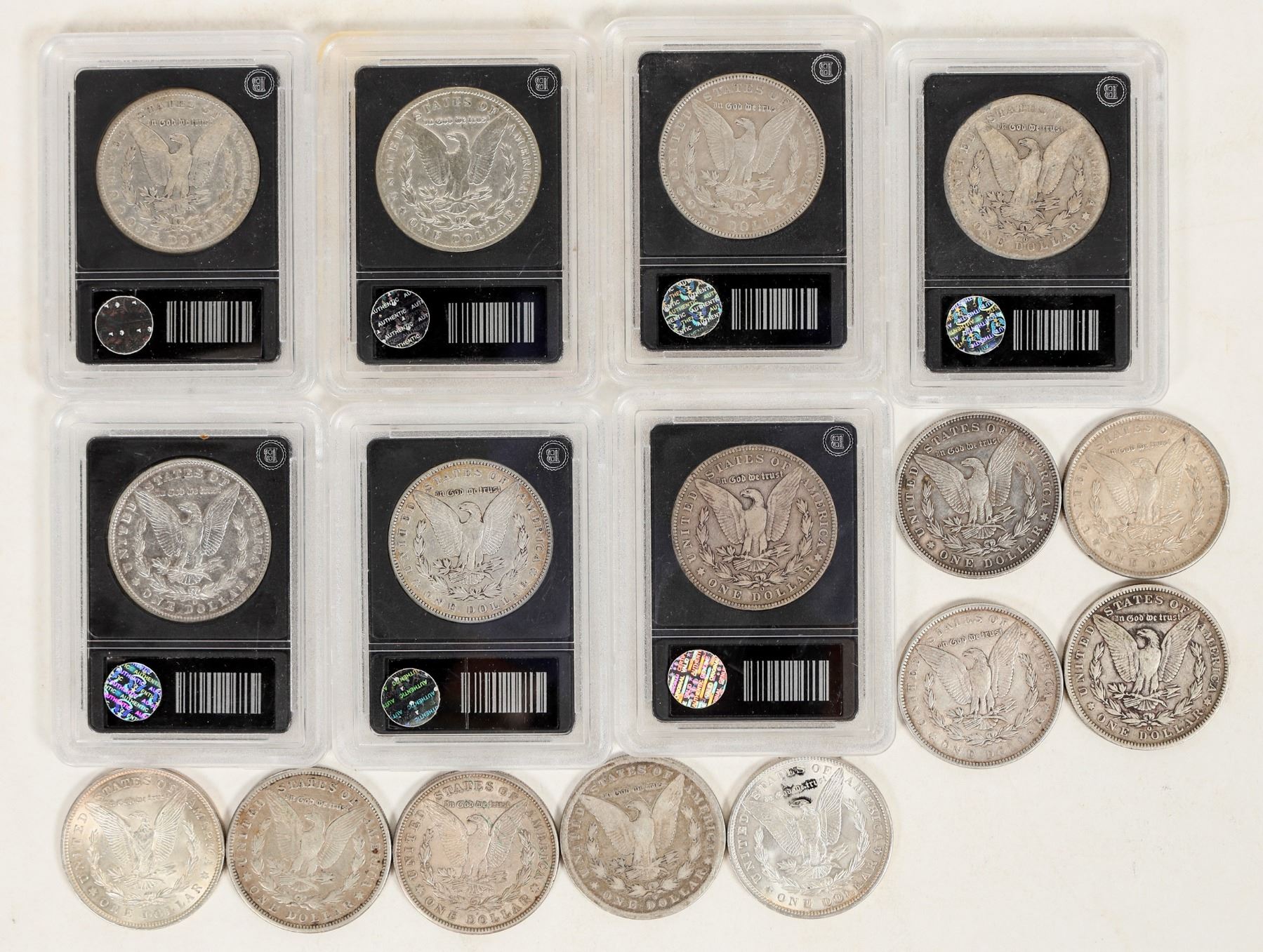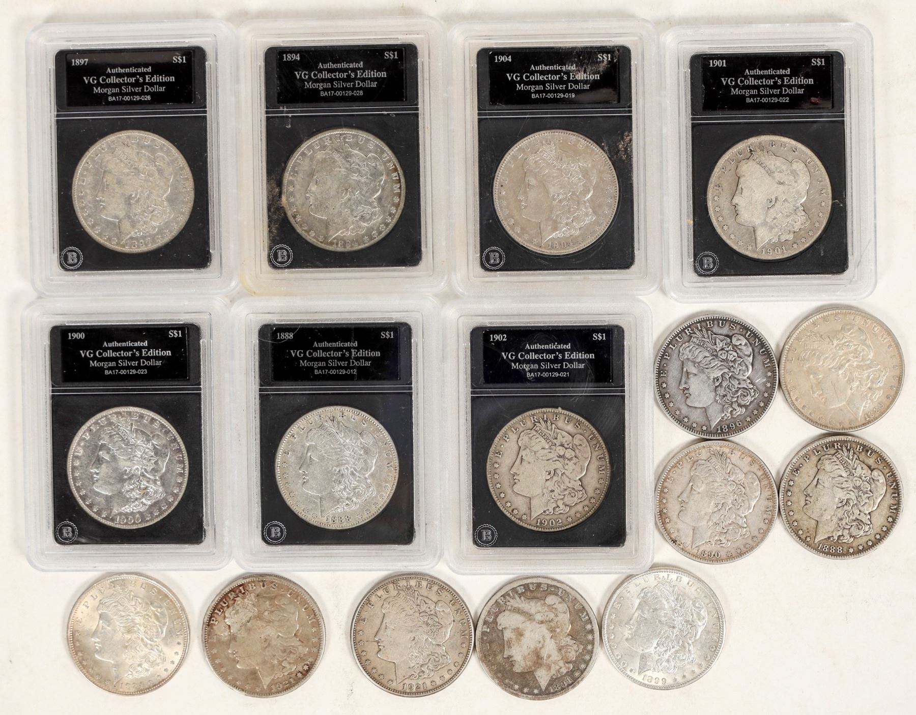 Sixteen circulated Morgan silver dollars. Seven are in hard plastic cases, issued by The Bradford Exchange and graded VG Collector's Edition: 1888; 1894; 1897; 1900; 1901; 1902; 1904. The other nine: 1896 (VG); 1888 -O (VG); 1889 (VG-F details, cloudy); 1890 (G-VG); 1899-O (F-EF); 1891-S (AG-G); 1921 (3: F-EF).