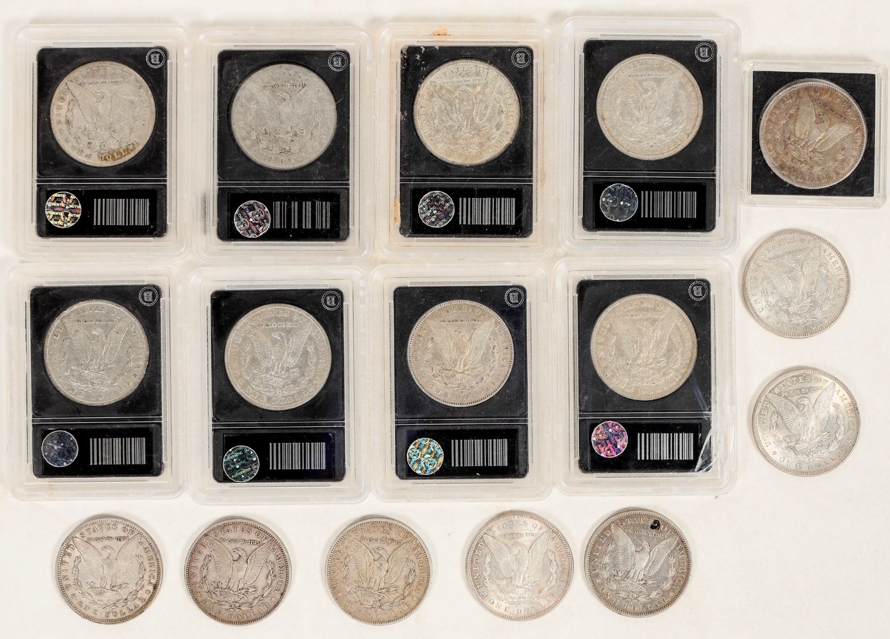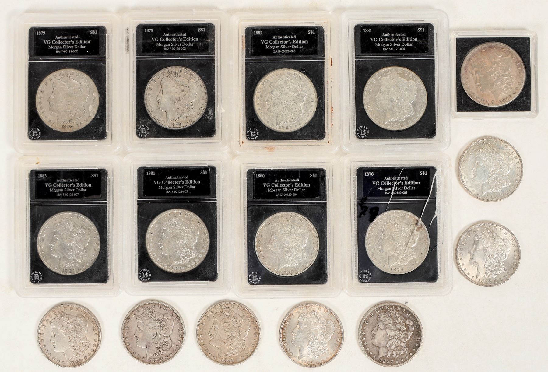 Sixteen Morgan dollars in VG condition or better. Eight are from The Bradford Exchange VG Collector's Edition: 1878 (case cracked);1879 (2); 1880 (2);1881 (2); 1882; 1883. Eight loose dollars: 1878 (VG); 1880 (VG-F); 1883-S (VG-F, plastic case); 1885-O (VG-F); 1885 (EF-AU); 1886 (EF-AU); 1887 (EF-AU); 1887-S (G-VG).