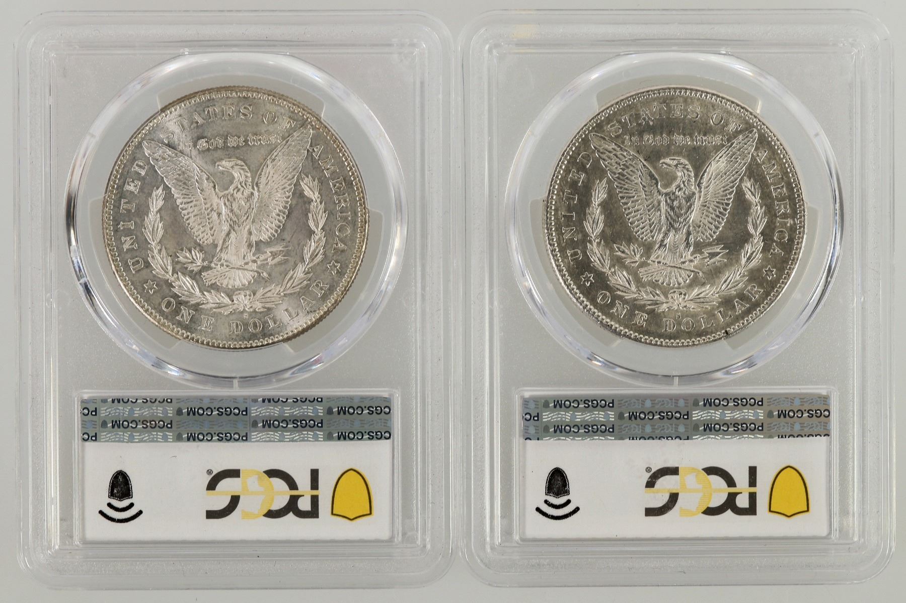 PCGS graded these two 1878-S Morgan dollars both MS 61. They certainly are both uncirculated, but 13890 is far superior, front and back. Interesting comparison in grading.