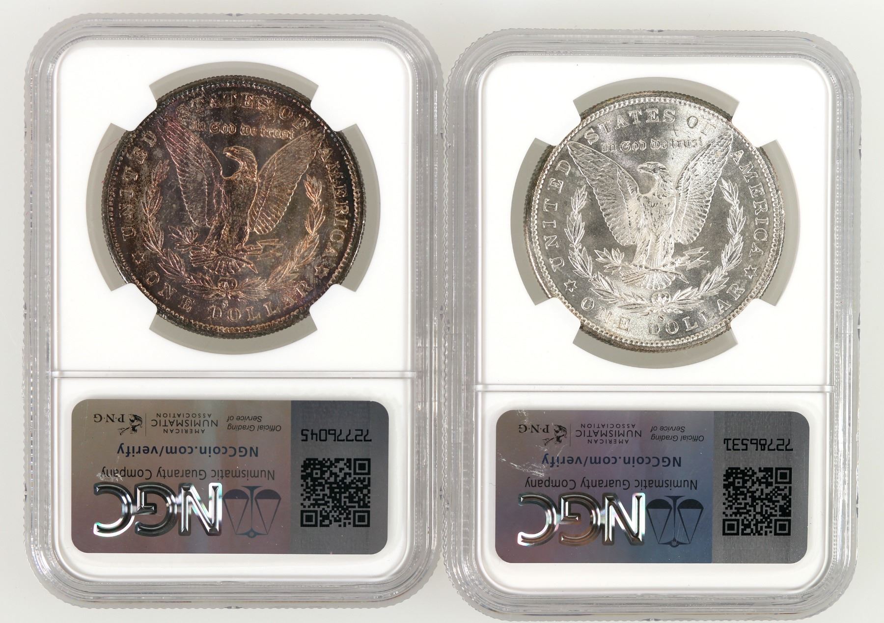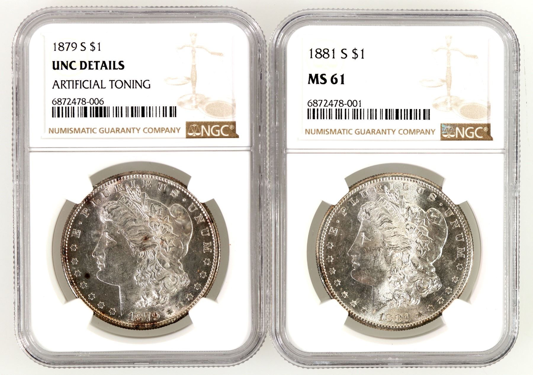 Lot of two NGC graded Morgan dollars: 1) 1879-S UNC Details: artificial toning. (We don't agree, we think the toning is original). 2) 1881-S MS 61. (We agree, the coin is uncirculated.)
