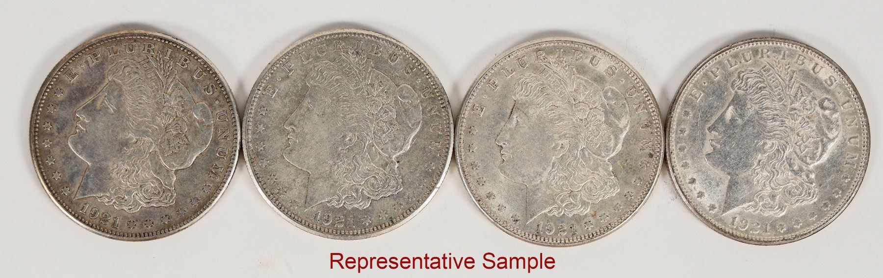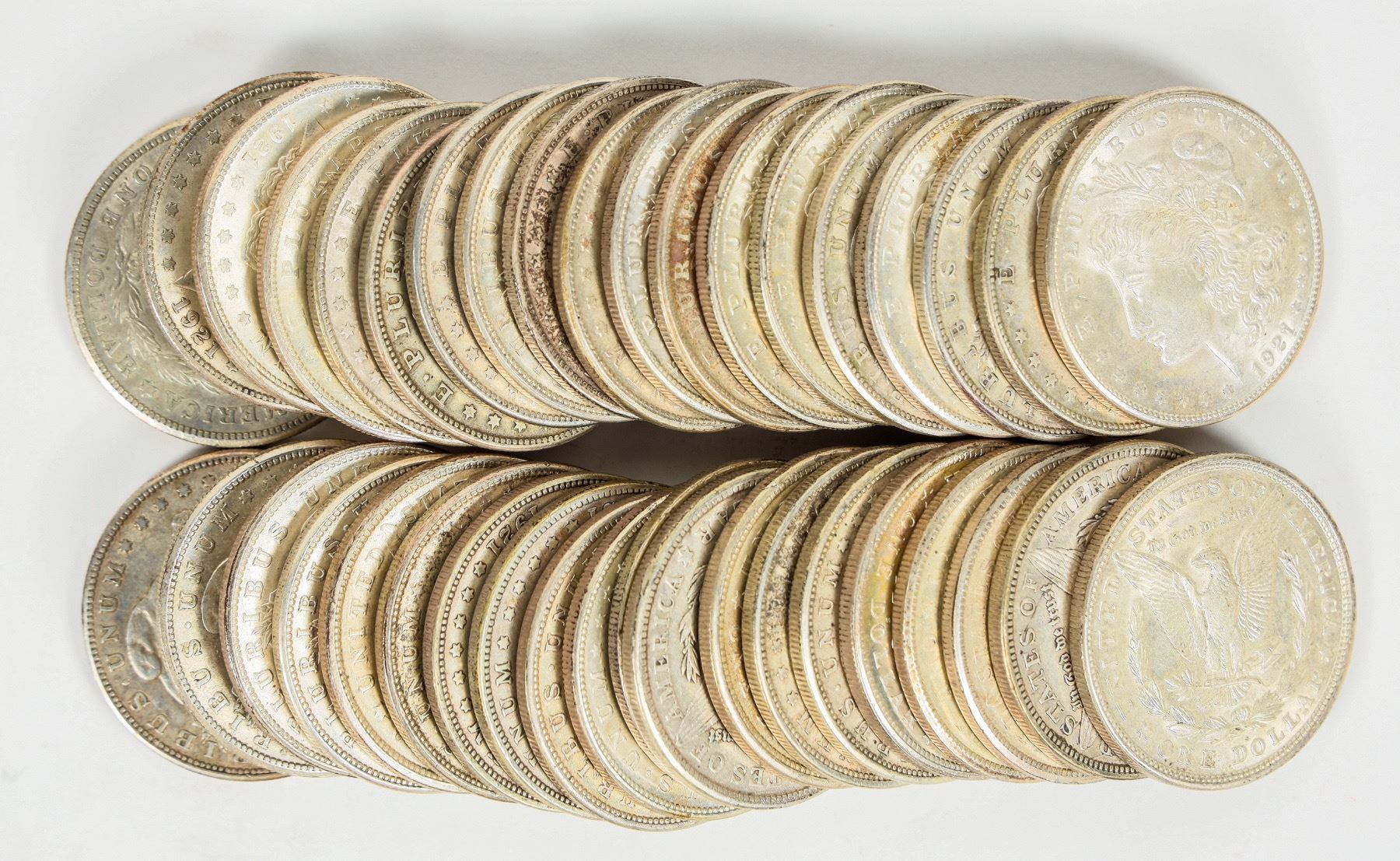 Forty Morgan dollars, all dated 1921. One uncirculated, most EF-AU condition.