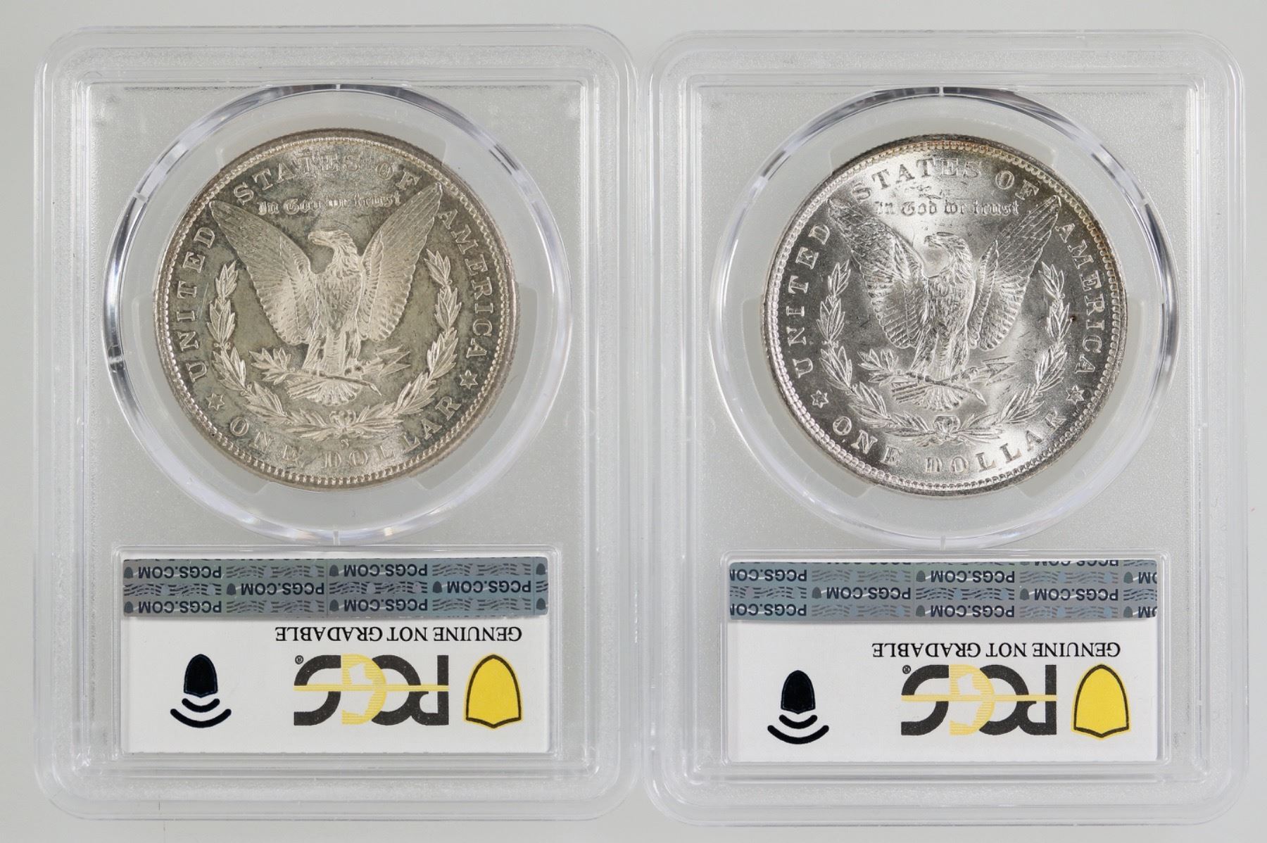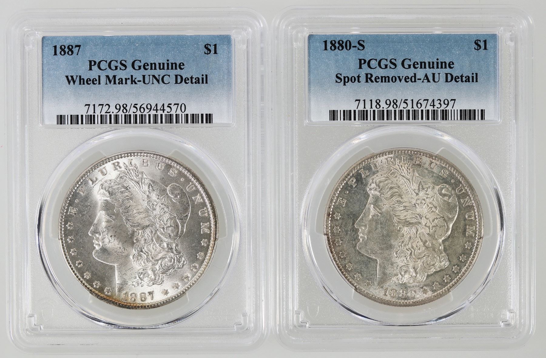 Two PCGS graded Morgan dollars: 1) 1880-S Genuine spot removed - AU details; 2) 1887 Genuine wheel mark - UNC detail. Both are attractive coins: maybe should be removed from their slabs!