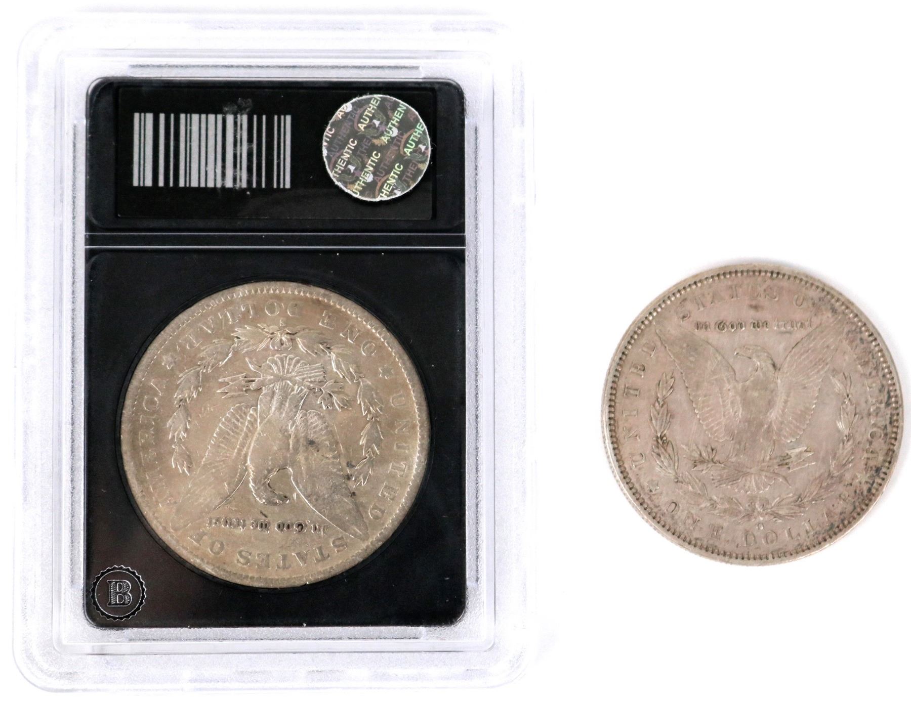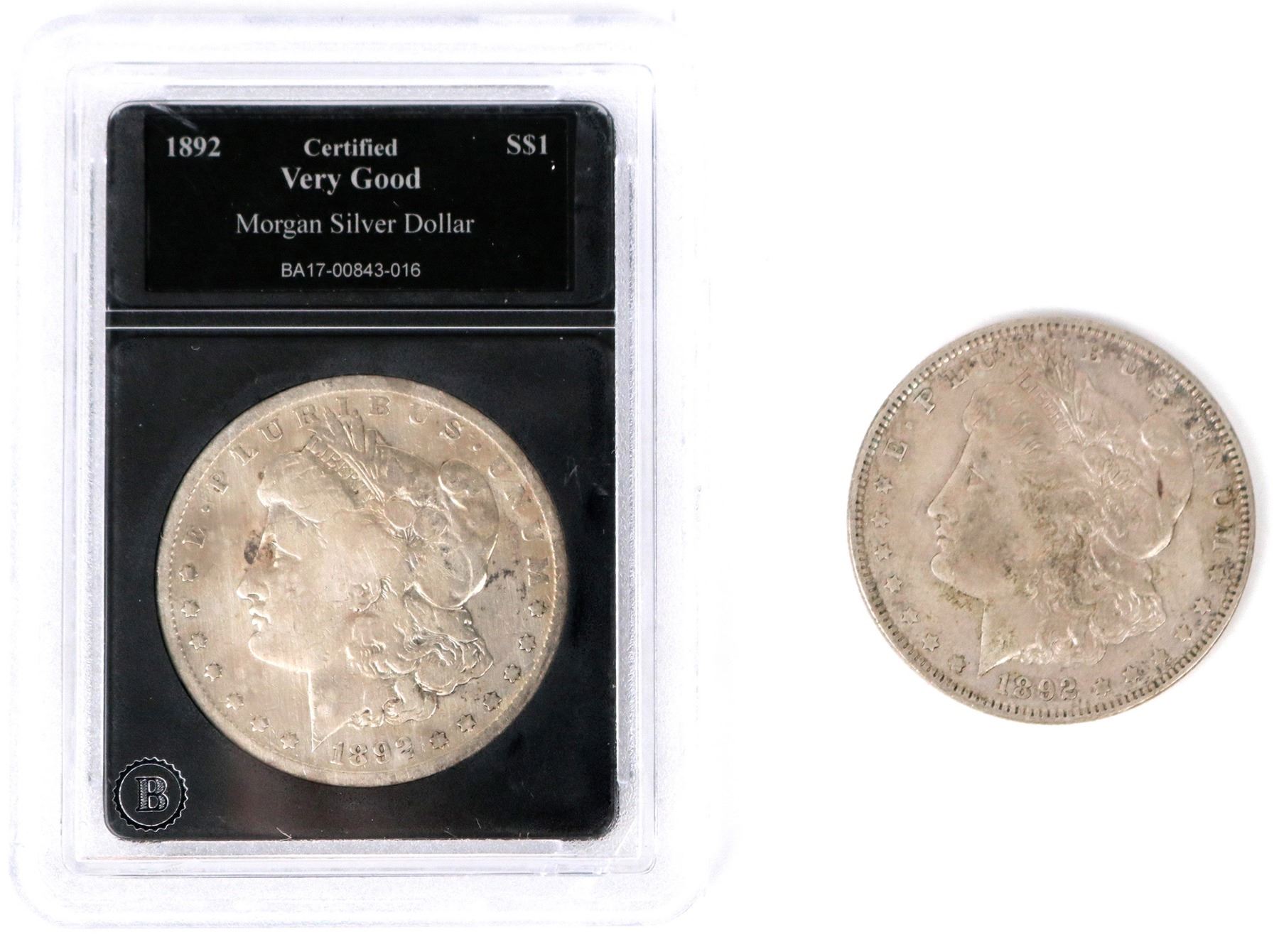 Two Morgan dollars: 1892 certified very good by The Bradford Exchange, but their grading was generous; 1892-O VG-F, needs conservation.