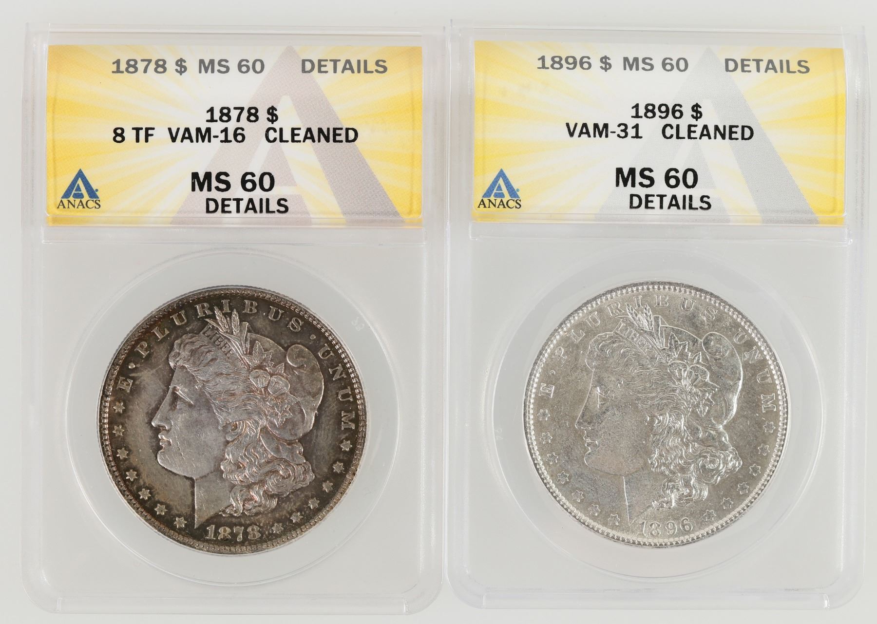 Two ANACS certified uncirculated, cleaned Morgan dollars: 1) 1878 8 tail feathers MS 60 Details VAM-16 cleaned. 2) 1896 MS 60 Details VAM-31 cleaned.