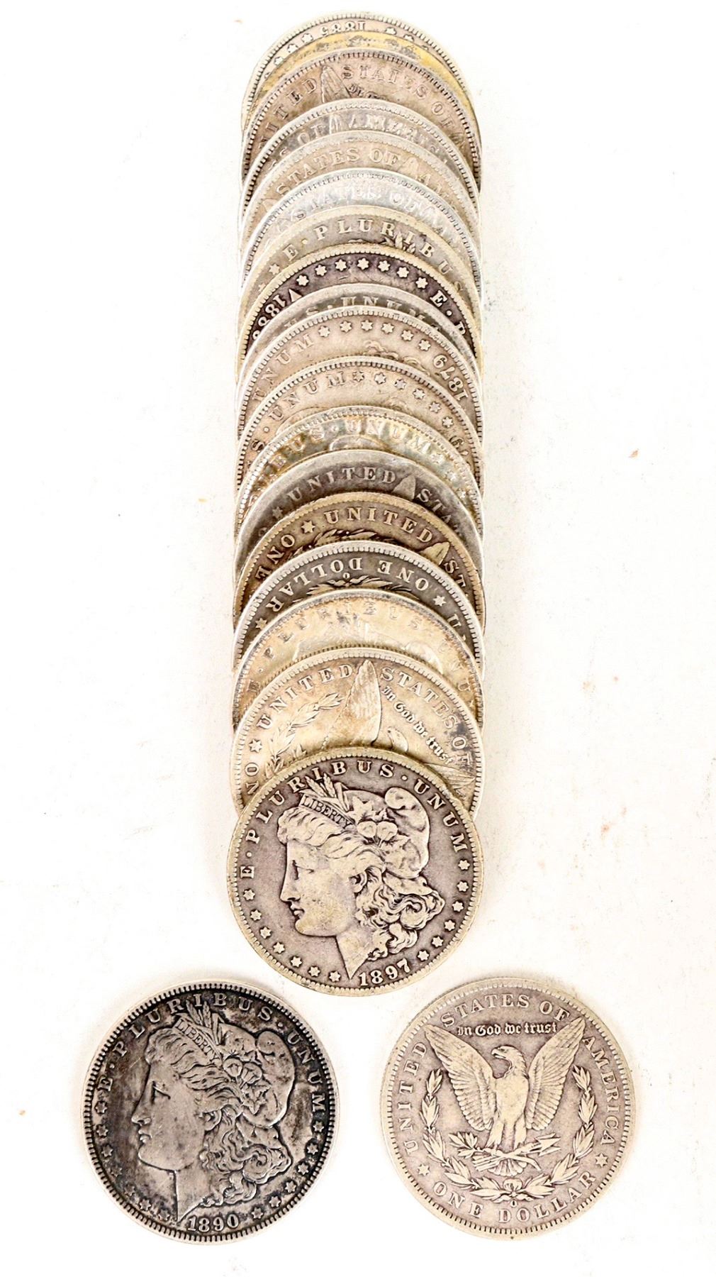 Roll of twenty circulated Morgan dollars. No 1921s. A couple polished, mostly VG-VF.