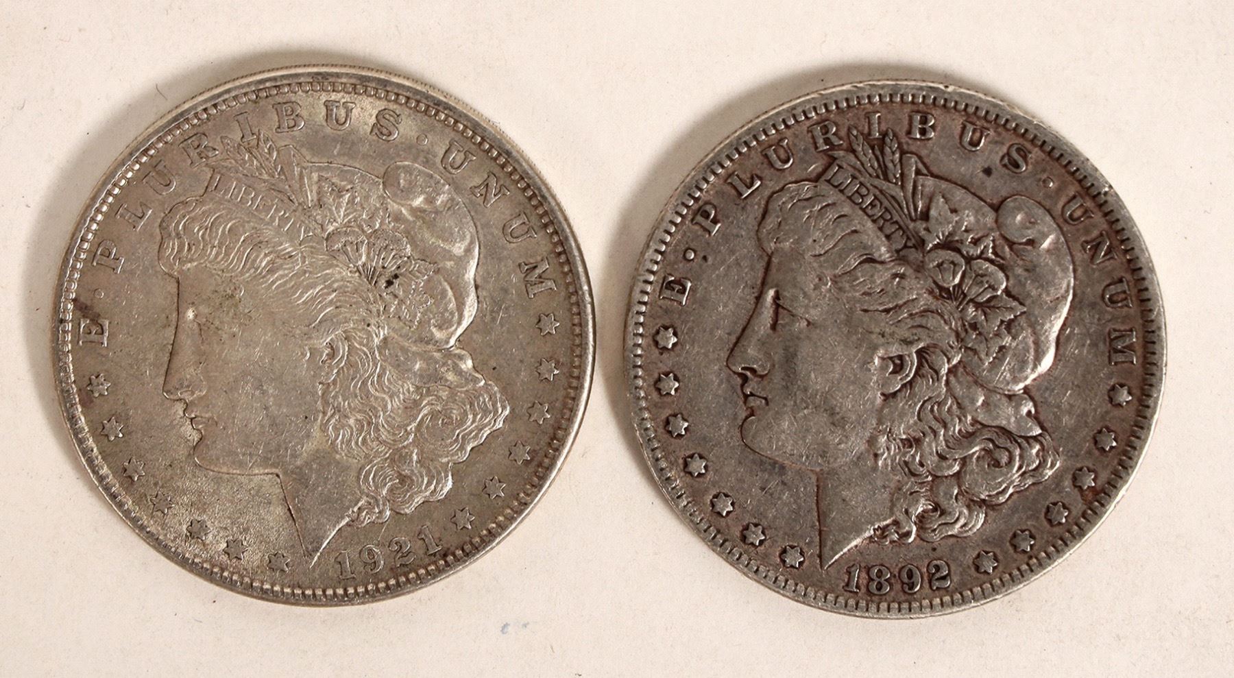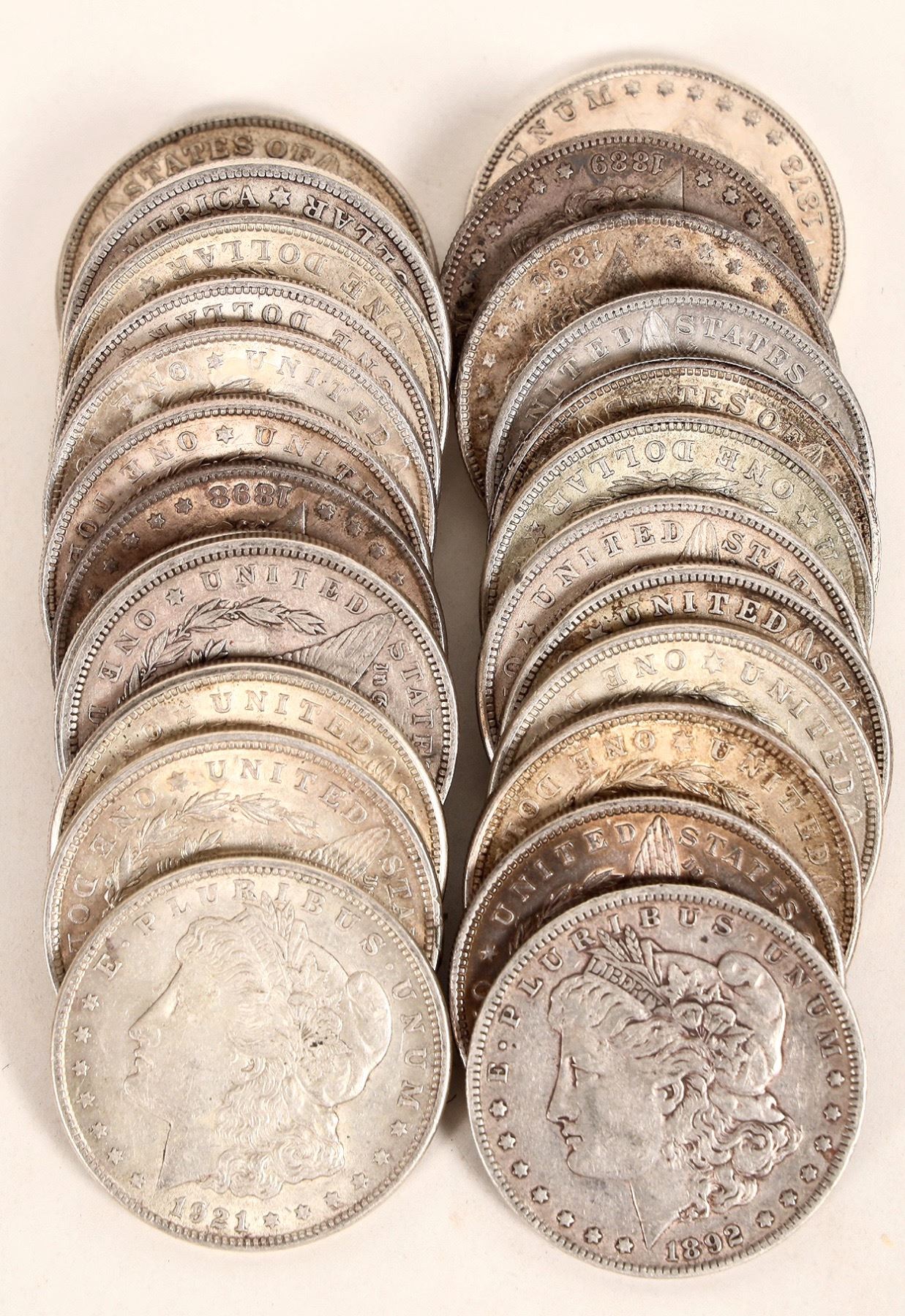 Circulated Morgan dollars (24); 1921 (13); 1800s (10); one 1900. Generally F-AU condition, some have scotch tape residue. [