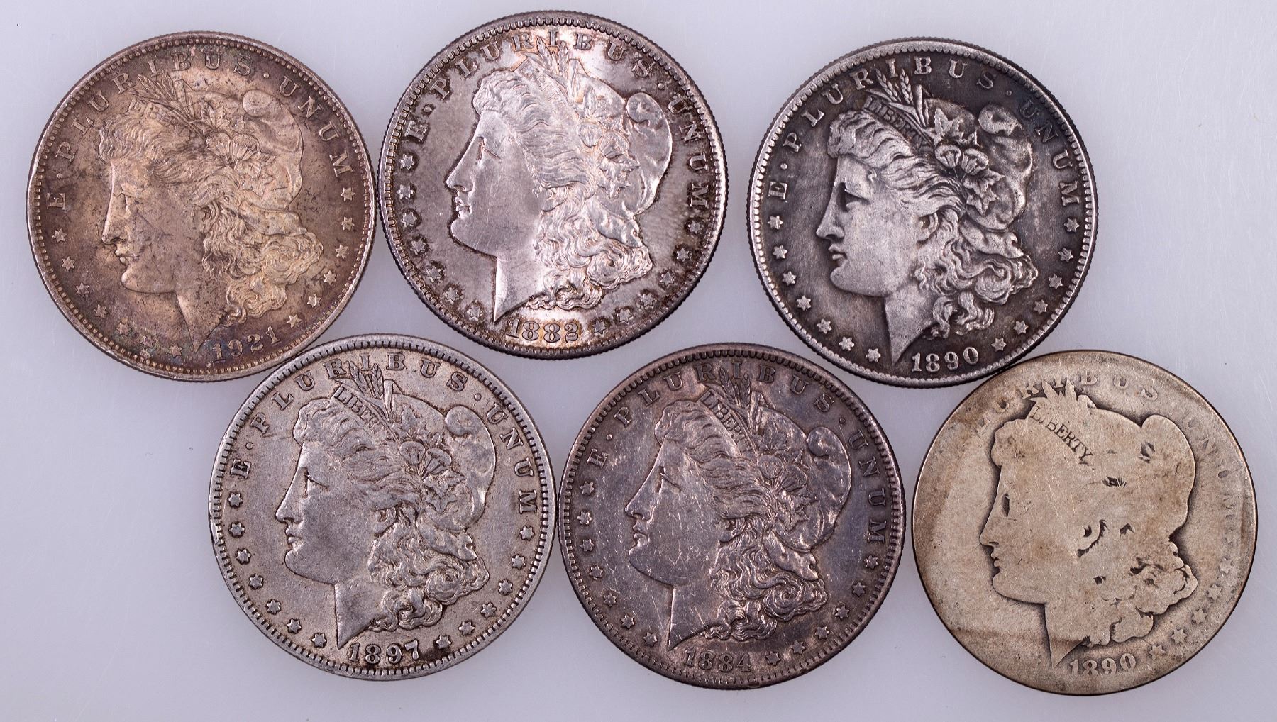 Lot of six circulated Morgan dollars: 1) 1882-S Ch. AU, luster on reverse; 2) 1884-S EF; 3) 1890-CC "copy", EF condition; 4) 1890-O AG; 5) 1897-O F-VF; 6) 1921 EF patina toning on reverse. State: City: Date: Provenance: