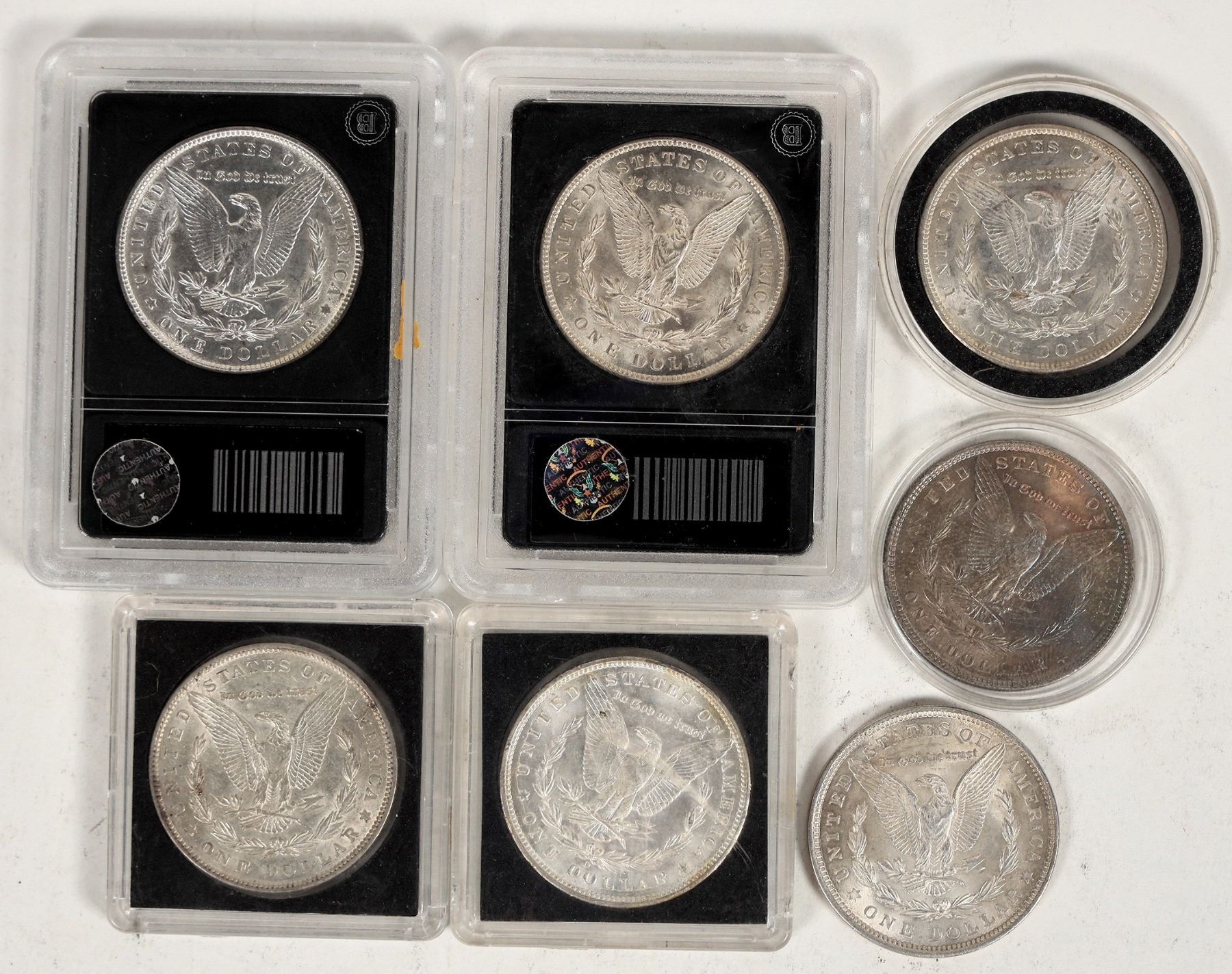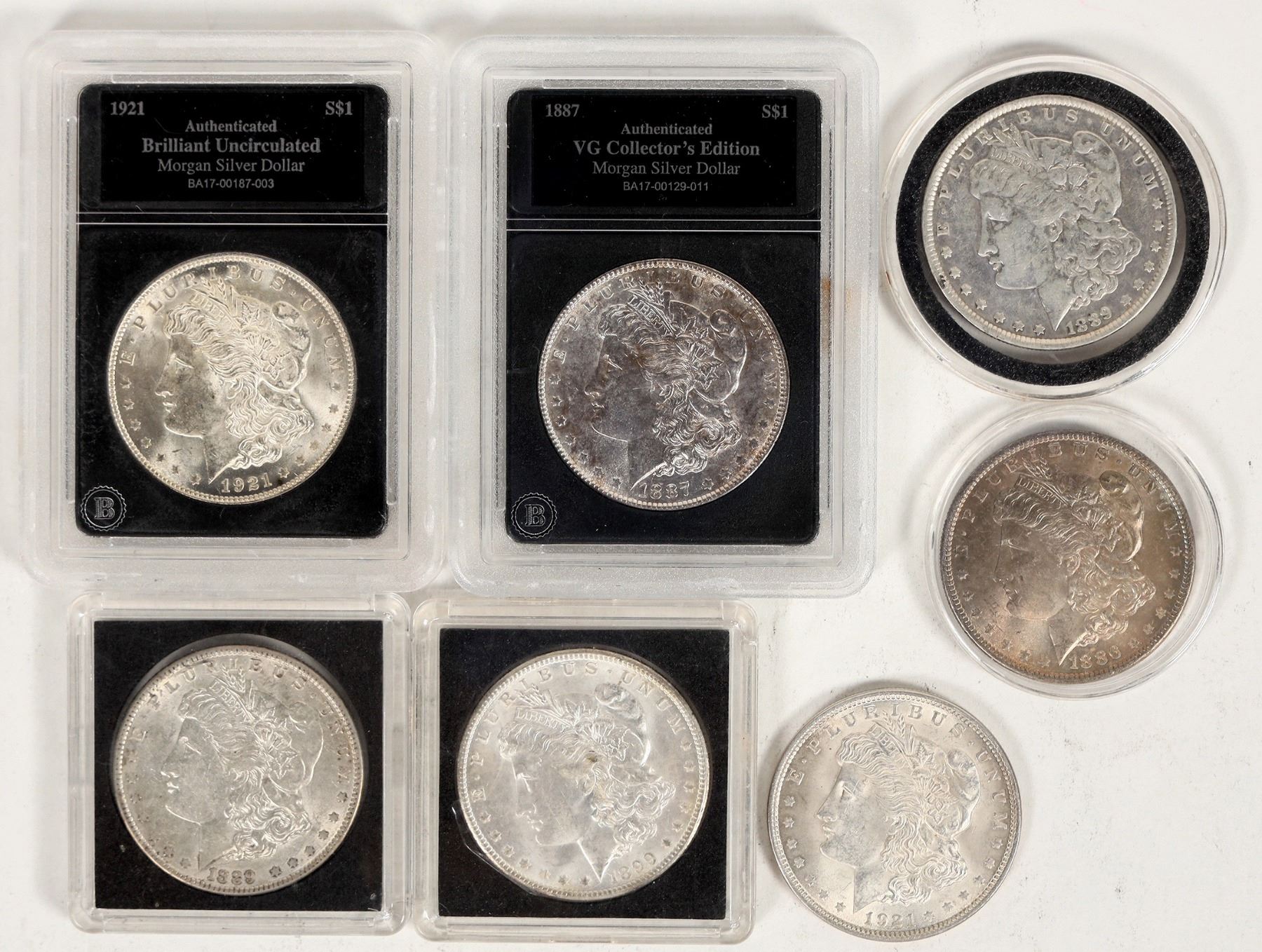 Seven Morgan dollars: 1886 (EF-AU); 1887 (VG, by the Bradford Exchange); 1889 (F-VF, polished); 1889 F-EF; 1899-O (F-VF); 1921 EF-AU; 1921 (BU, certified by the Bradford Exchange).