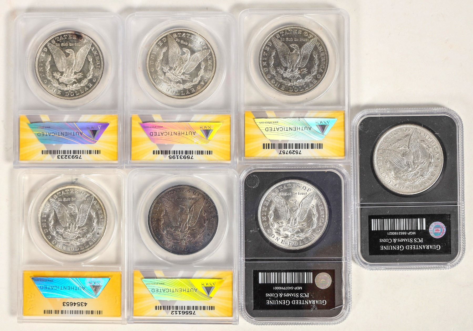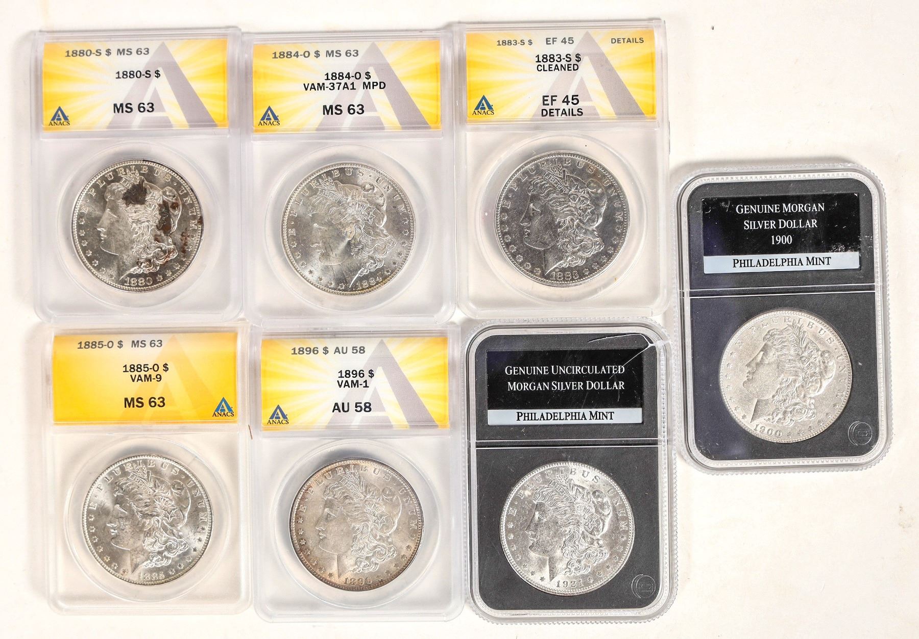 Seven Morgan dollars: 1880-S MS 63 ANACS (carbon spots); 1883-S EF 45 details cleaned ANACS; 1884-O MS 63 (VAM-37A1) ANACS; 1885-O MS 63 (VAM-9) ANACS; 1896 AU 58 (VAM-1) ANACS; 1900 Genuine PCS Stamps and Coins; 1921 Genuine Uncirculated, PCS Stamps and Coins.