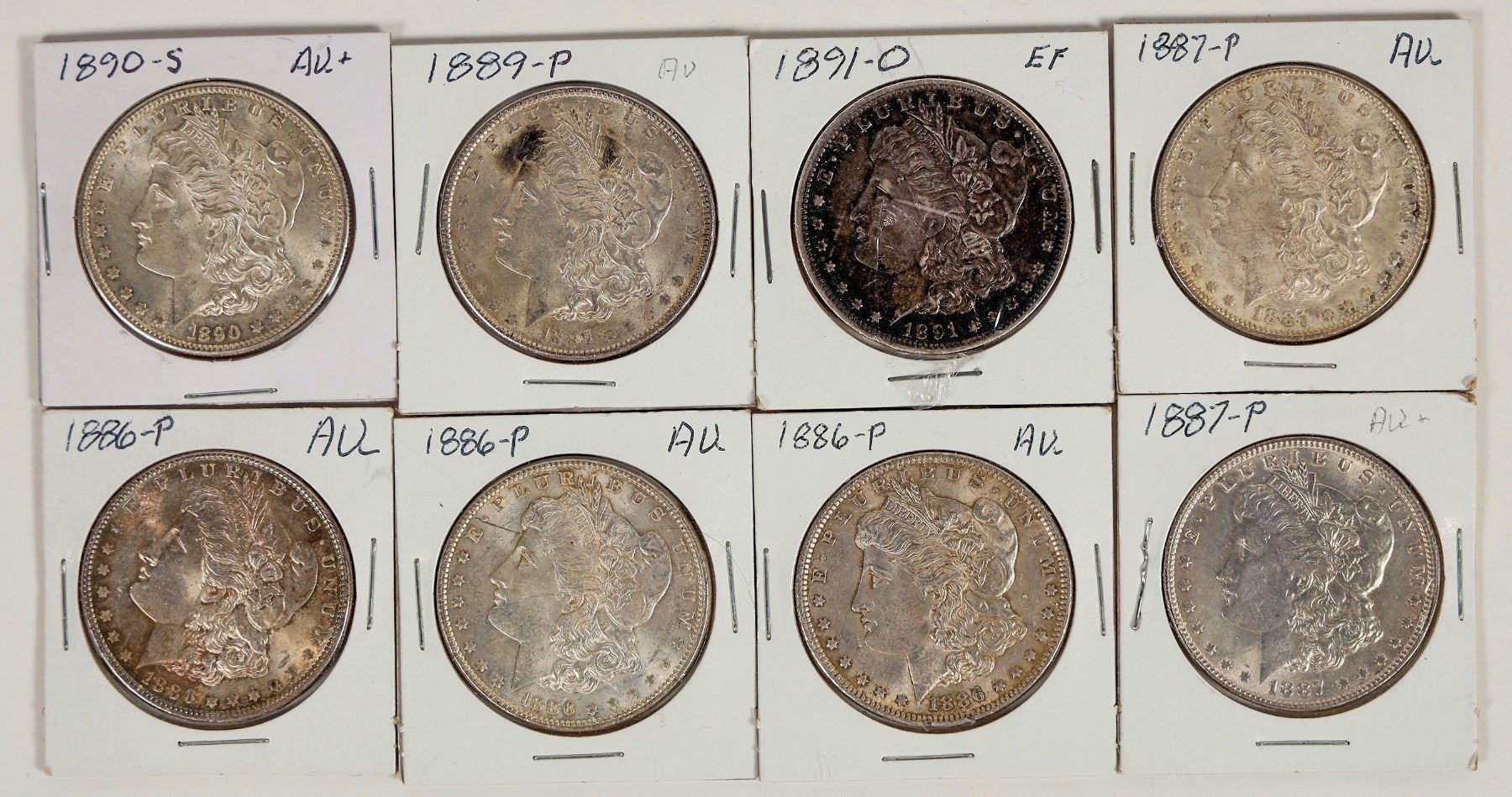 Eight Morgan dollars: 1886 (3: AU); 1887 (2: AU); 1889 (AU; carbon spots); 1890-S (AU); 1891-O (EF; nicely toned reverse).
