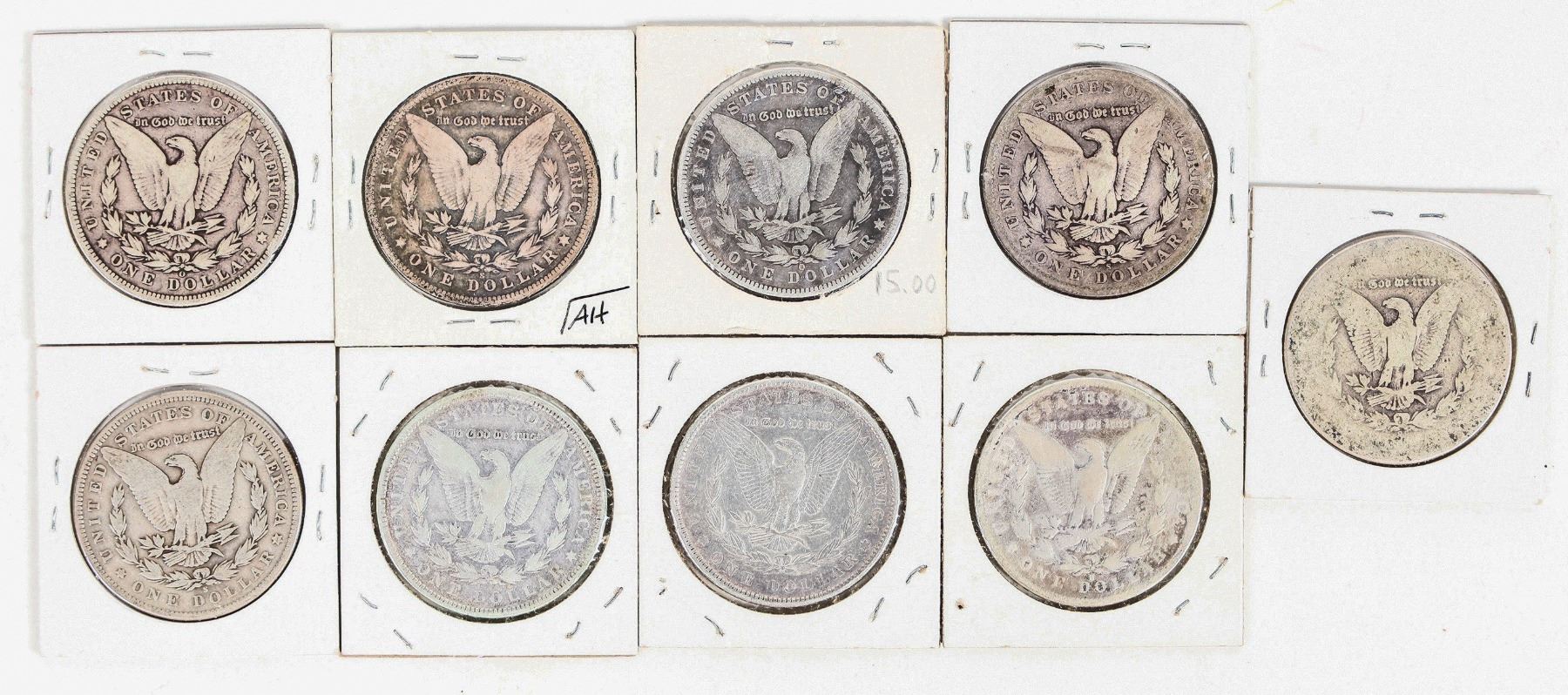 Nine Morgan dollars: 1878-CC (poor-fair); 1883-S (G); 1889 (F); 1892 (VG); 1896-S (G); 1896-O (VG); 1896-O (F); 1903-S (G-VG); 1904-S G-VG).