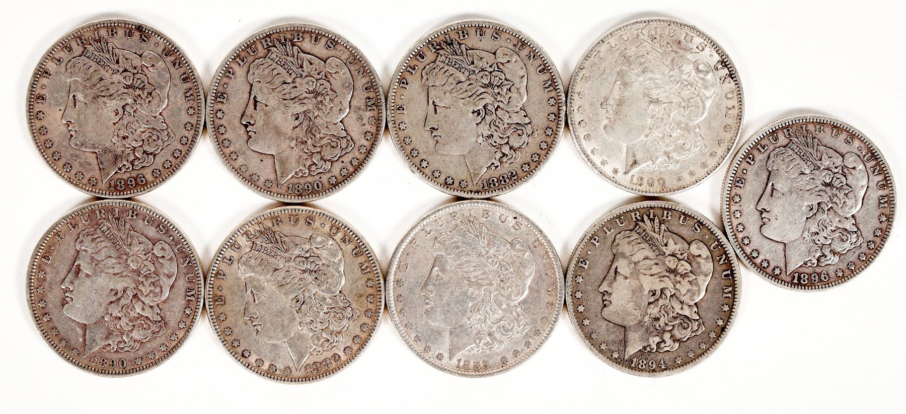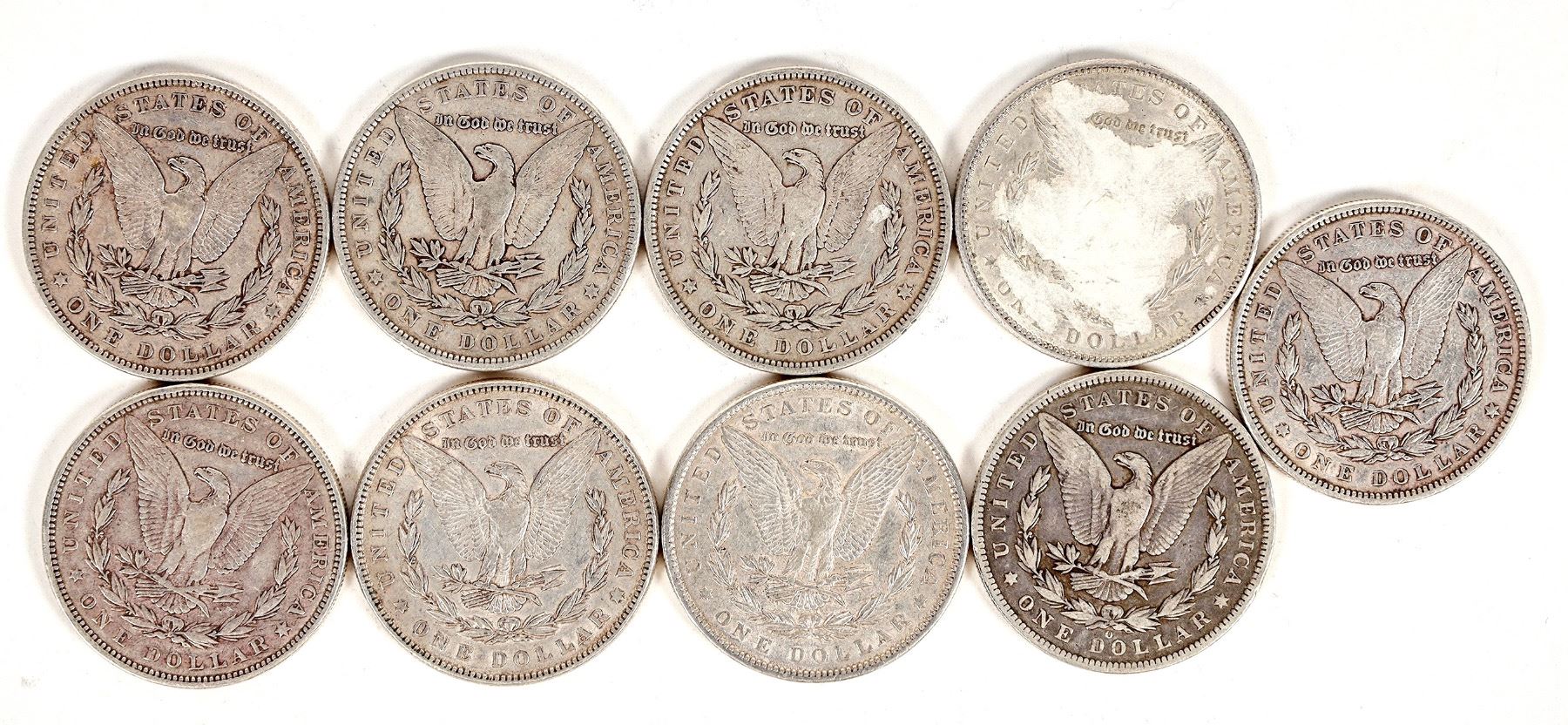 Nine Morgan dollars: 1882 (2); 1889; 1890 (2); 1894-O; 1896 (2) ; 1900 (paper on reverse). Mostly VG-EF condition.