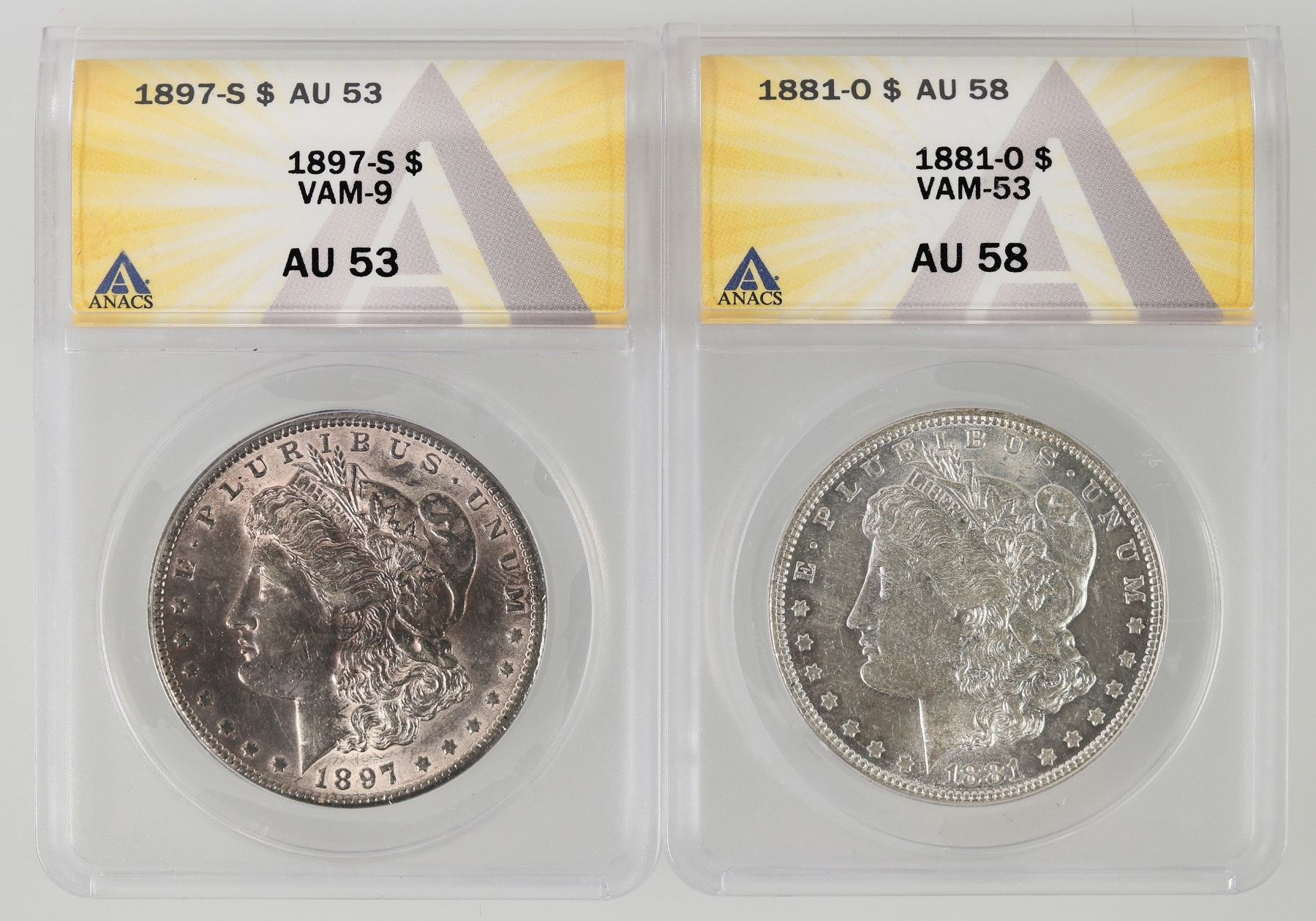 Two ANACS graded Morgan dollars: 1) 1881-O AU 58; VAM-53. 2) 1897-S AU 53; VAM-9.