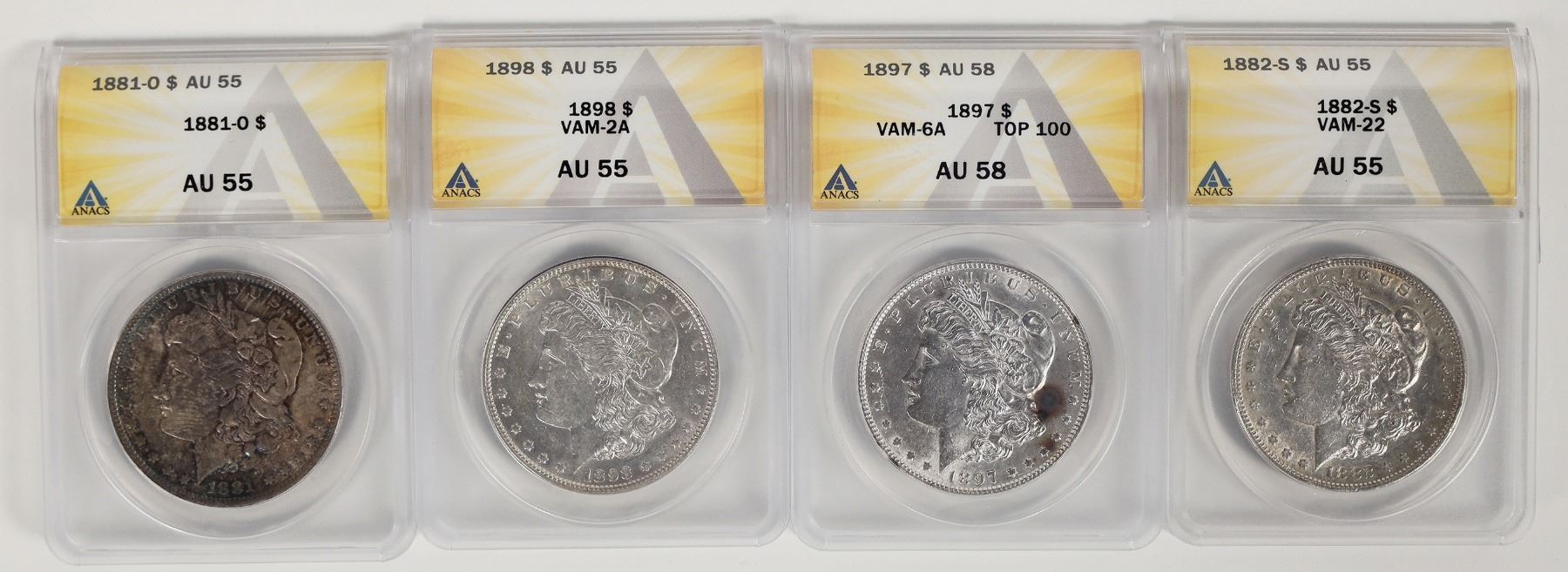 Four ANACS certified Morgan dollars almost uncirculated: 1) 1881-O AU 55 (toned); 2) 1882-S AU 55; VAM-22; 3) 1897 AU 58; VAM-6A, (carbon spots); 4) 1898 AU 55, VAM-2A.