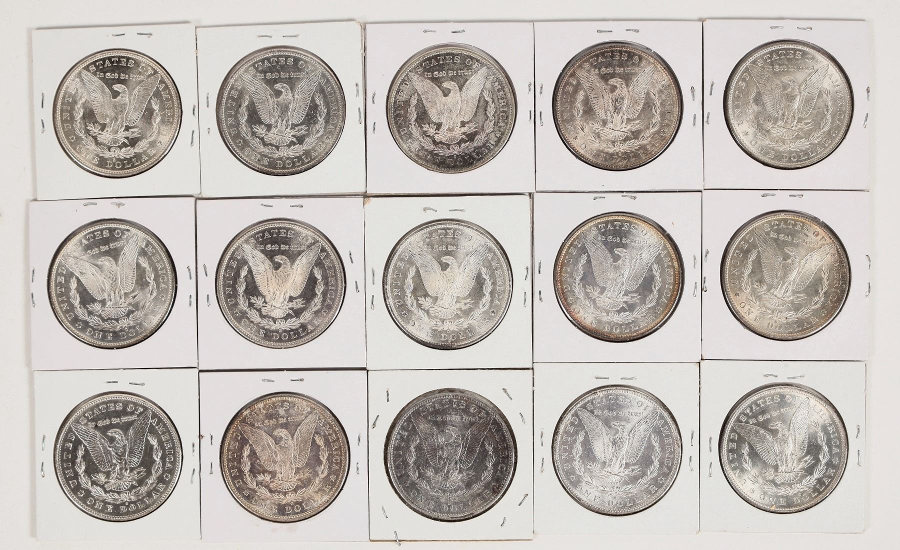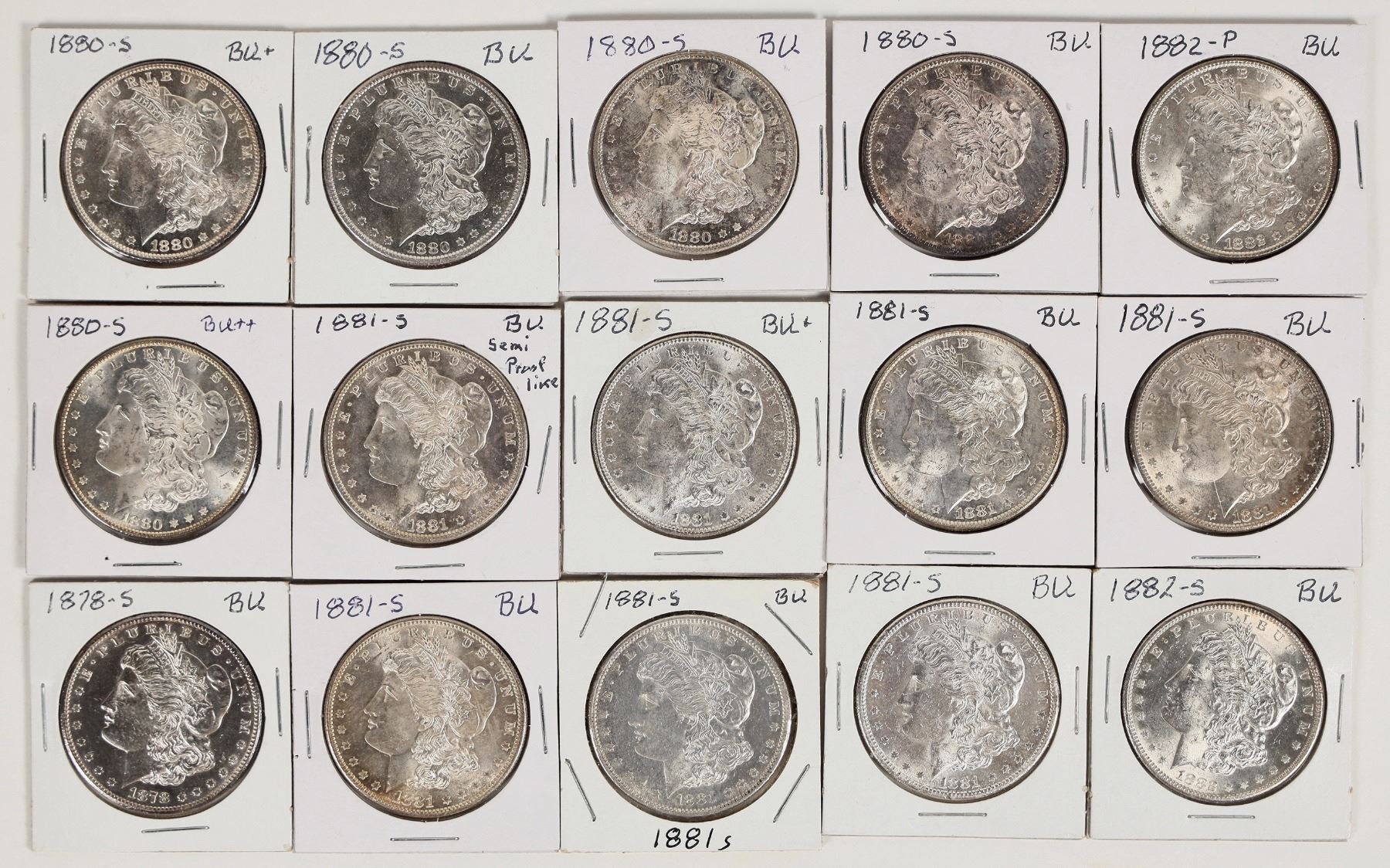 Fifteen brilliant uncirculated Morgan dollars: 1878-S; 1880-S (5); 1881-S (7); 1882; 1882-S.