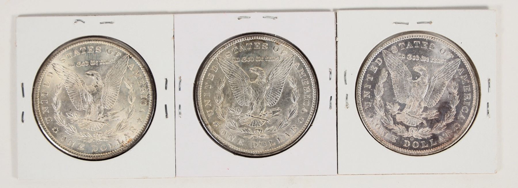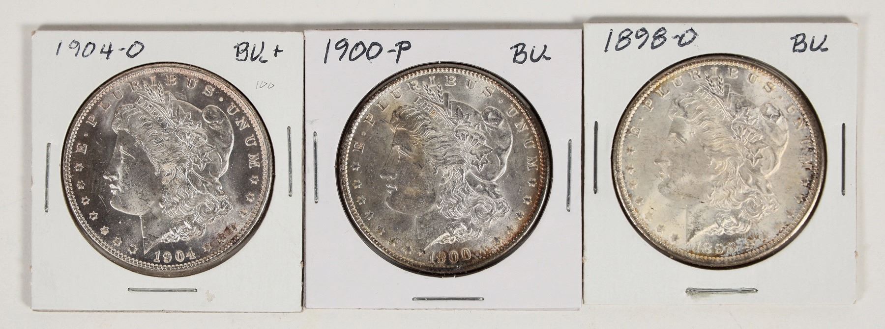 Three BU Morgan dollars: 1898-O; 1900 (slight toning obverse); 1904-O (very nice coin).