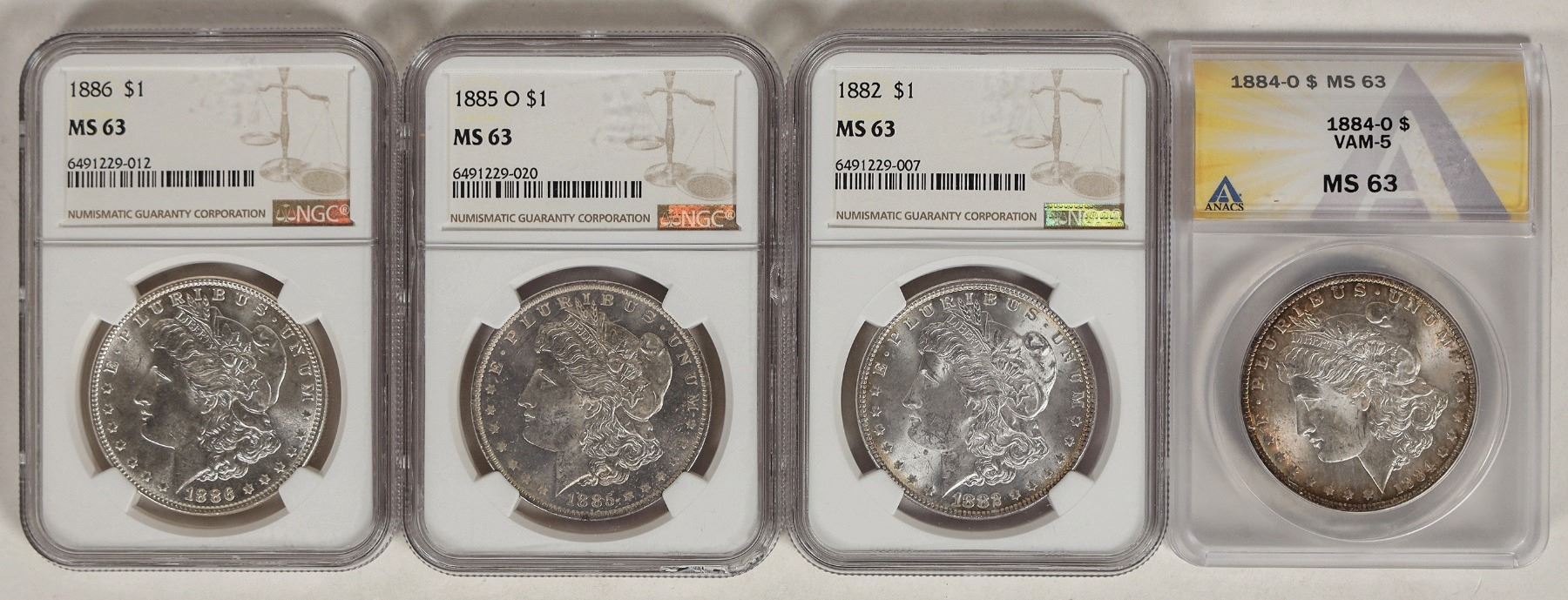 Four graded Morgan dollars: 1) 1882 MS 63 NGC; 2) 1884-O MS 63 (VAM-5) ANACS; 3) 1885-O MS 63 NGC; 4) 1886 MS 63 NGC.