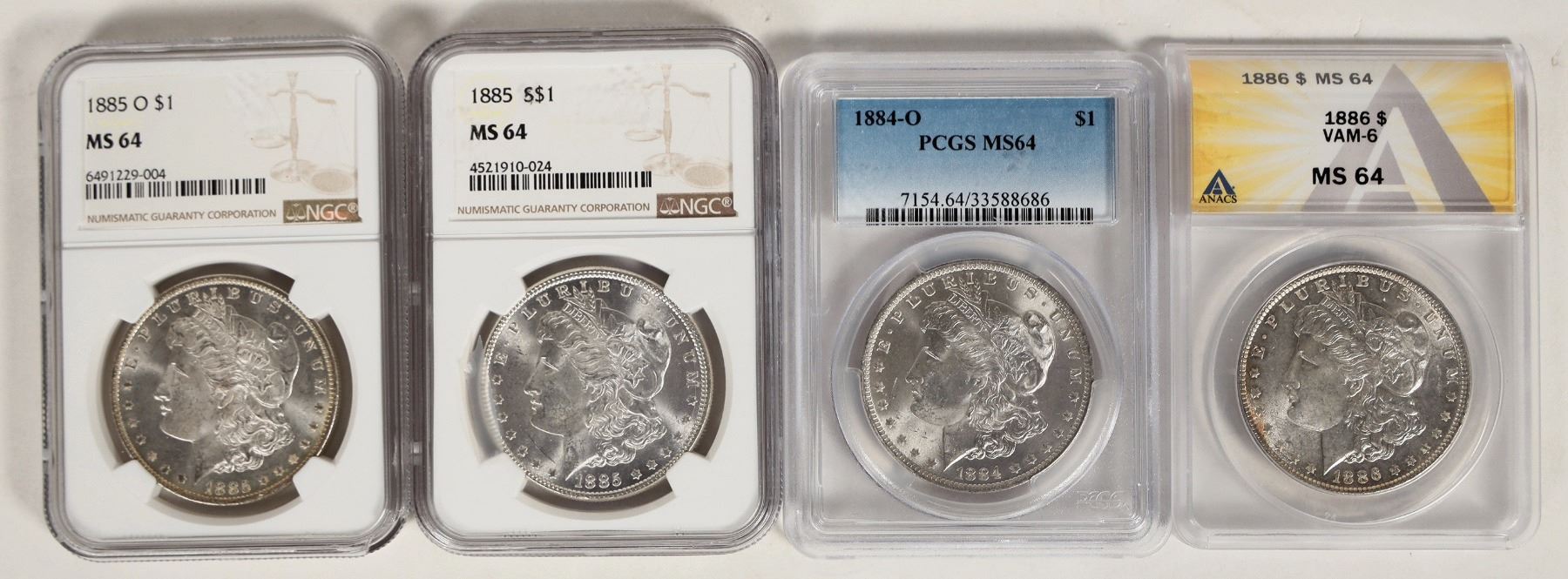 Three different grading companies determined these four Morgan dollars were MS 64; see how they compare! 1) 1884-O PCGS; 2) 1885 NGC; 3) 1885-O NGC; 4) 1886 (VAM-6) ANACS.