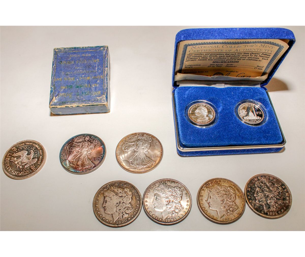 Morgans are fair: 1880, 1883, two 1921 Denver. 1986 Liberty Silver Round. Two 2002 Liberty One Dollar rounds. Two 2006 small proofs: 51st State quarter. Certificate of Authenticity 01574. Date: 1880-today hwac 20421