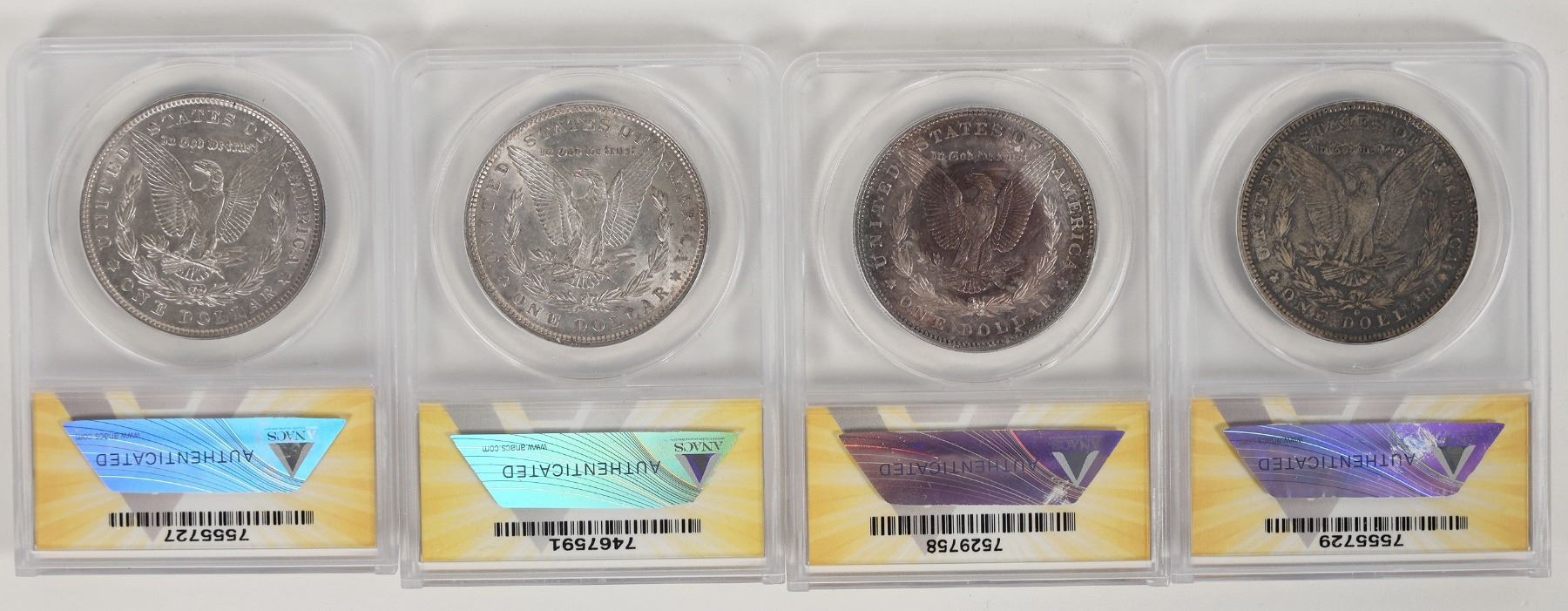 Problem children: four Morgan dollars certified by ANACS: 1) 1885 MS 60 details, artificially toned, VAM-4B. 2) 1888 AU 55 details, scratched; VAM-11A dbl ear. 3) 1892-O AU 50 details, environmental damage. 4) 1903 AU 58 details, cleaned.