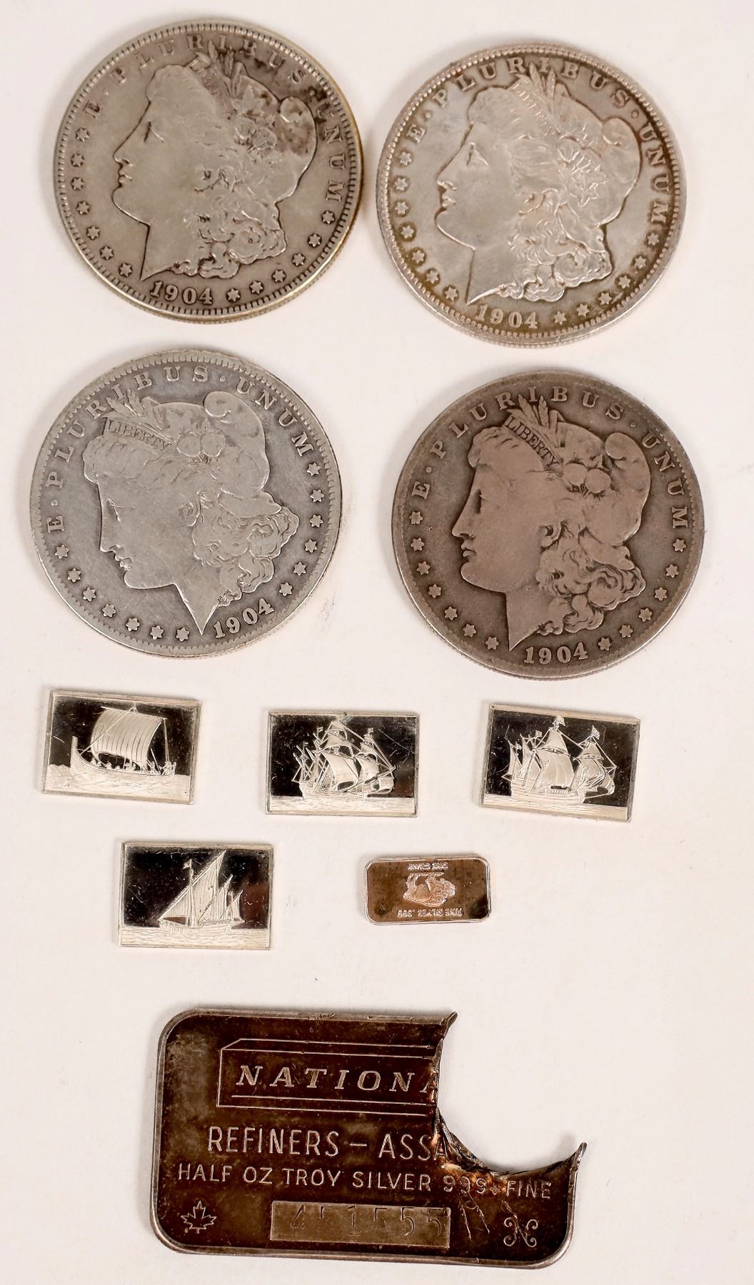 Four 1904 Morgan dollars: AG-Fine condition. Four ingots with sailing ships each two grams. A Canadian half ounce ingot with a bite taken out of it (it weighs 13 grams now). And the smallest ingot you'll ever see: one gram with a buffalo on each side.