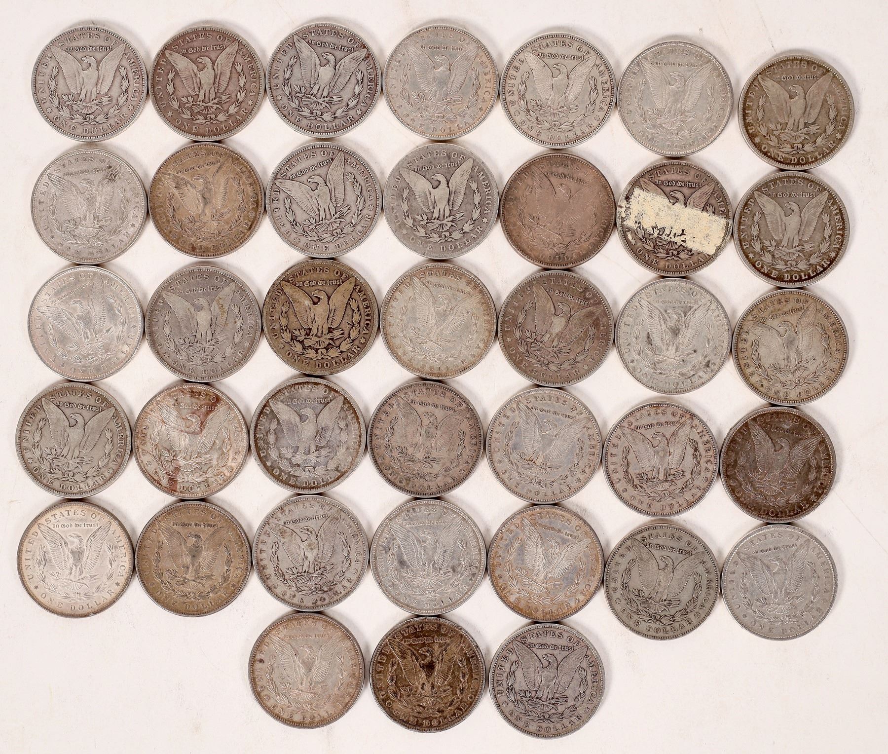 Lot (x38) Morgan silver dollars from Philadelphia. Only two 1921, mostly 1800s. Mostly VG-EF condition.