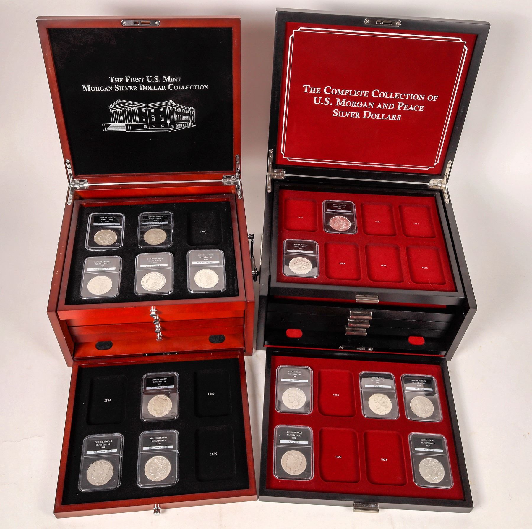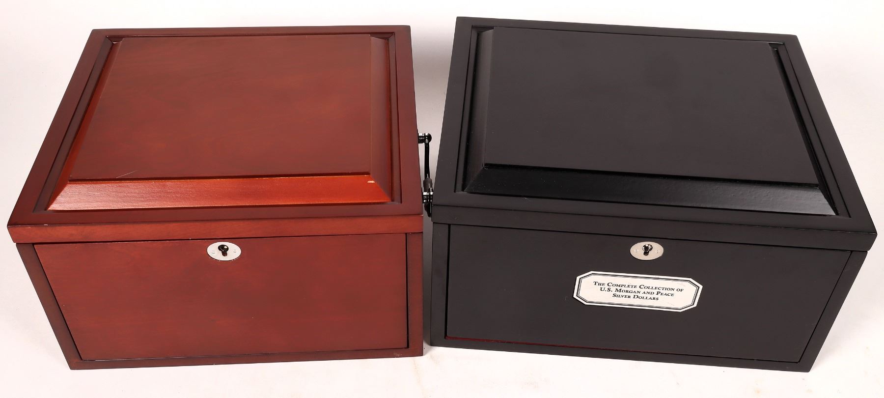 Two wooden cases issued by PCS Stamps and Coins, (12 x 11 x 7 inches), 1) The Complete Collection of U. S. Morgan and Peace Silver Dollars (ebony wood): five drawers, with seven silver dollars and empty spaces for 32 more. 2) The First U. S. Mint Morgan Silver Dollar Collection (brown wood): five drawers, with eight silver dollars and empty spaces for 18 more.