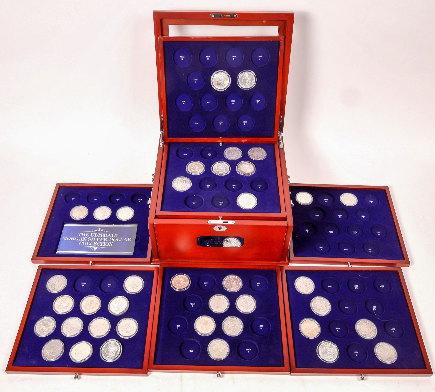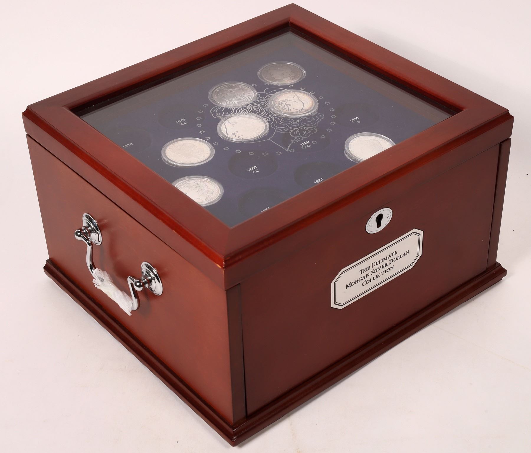 Created by PCS Stamps and Coins, The Ultimate Morgan Silver Dollar Collection is housed in a locking, glass topped wooden case (12 x 11 x 7 inches). With seven sliding drawers, the case can hold all the Morgan dollars made until 1921. Included are 39 Morgan dollars ranging from VG-BU condition. Dates and mintmarks have not been checked to see if they're in the right locations. Finish the collection!