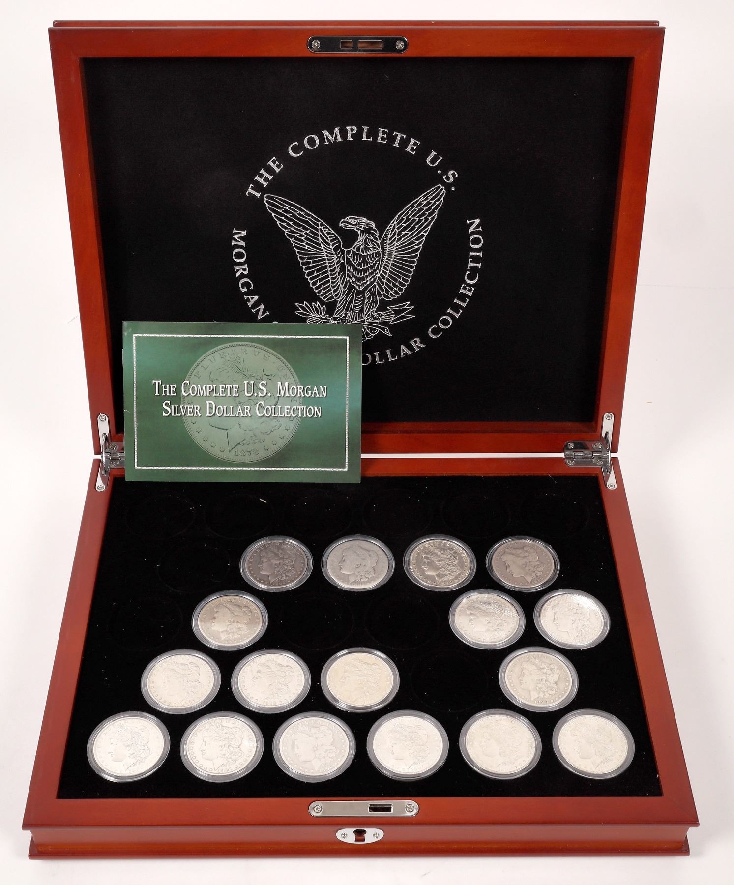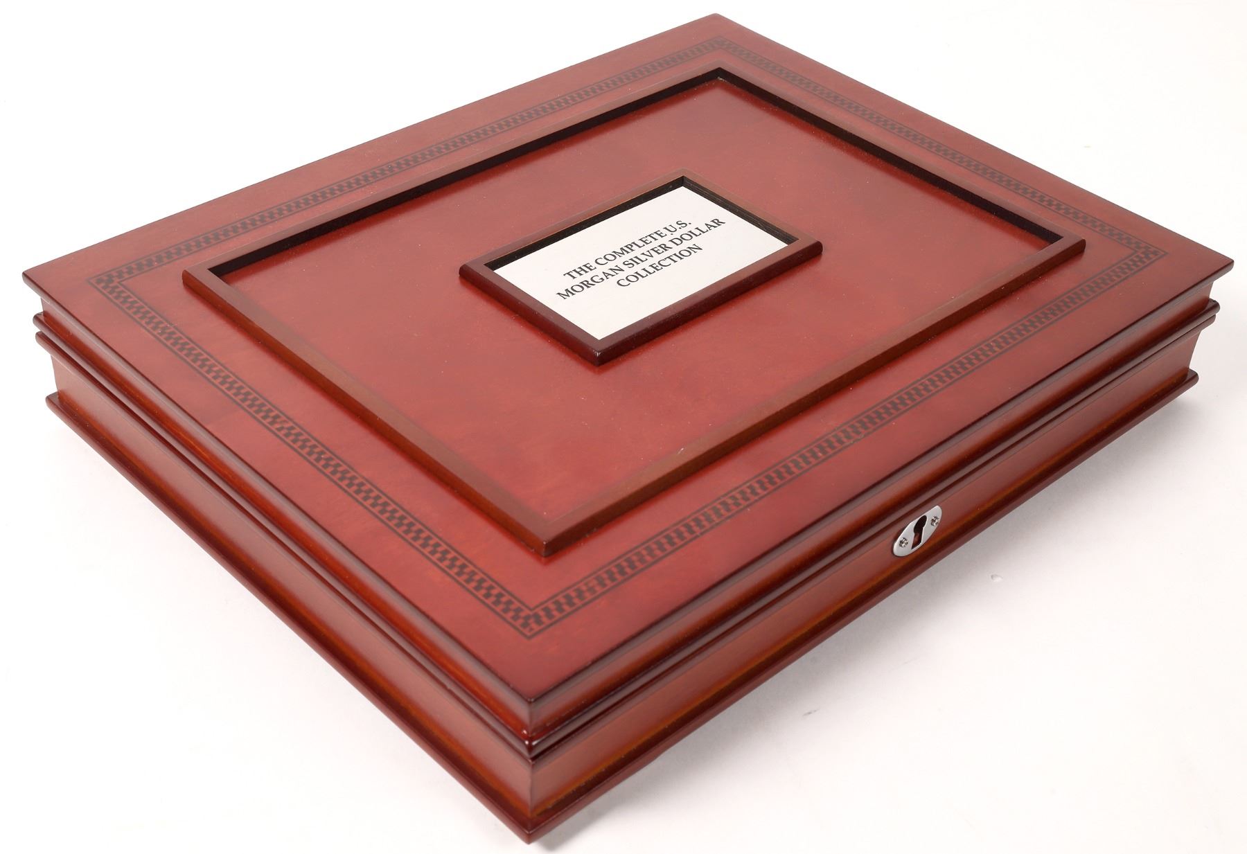Issued by PCS Stamps and Coins. Wooden case (14 x 11 x 3 inches) labelled "The Complete U. S. Morgan Silver Dollar Collection." Contains 17 Morgan dollars; one is about good, the rest are VF-AU condition. Room for 11 more coins.