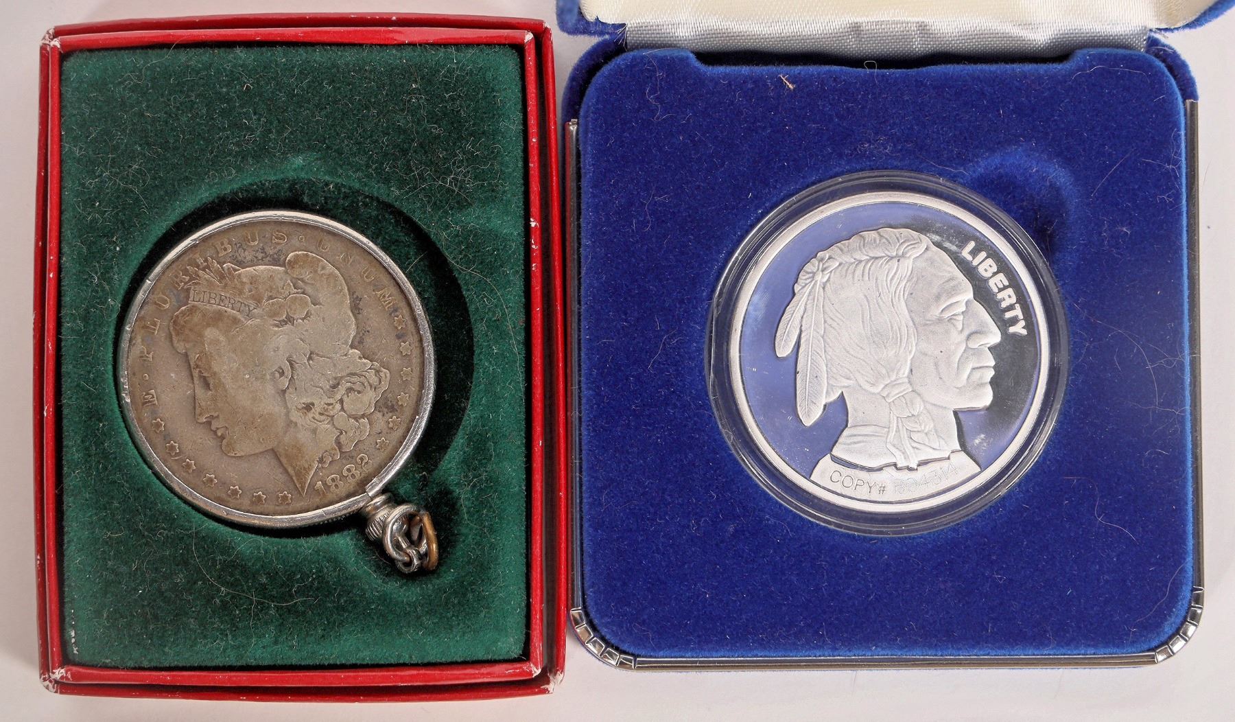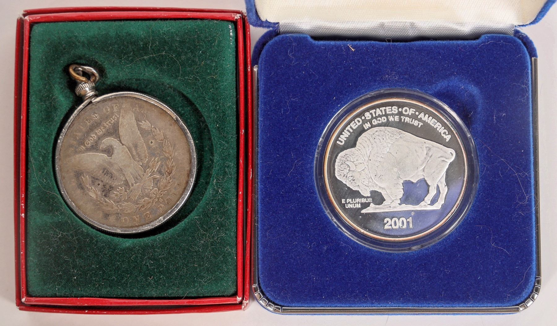 Lot of two pieces of silver: 1882-S Morgan dollar in bezel; G-VG condition. National Collectors Mint 2001 silver round in blue velvet case. Indian head obverse, Buffalo reverse. (not marked silver, but the company is run by Barry Goldwater Junior.)