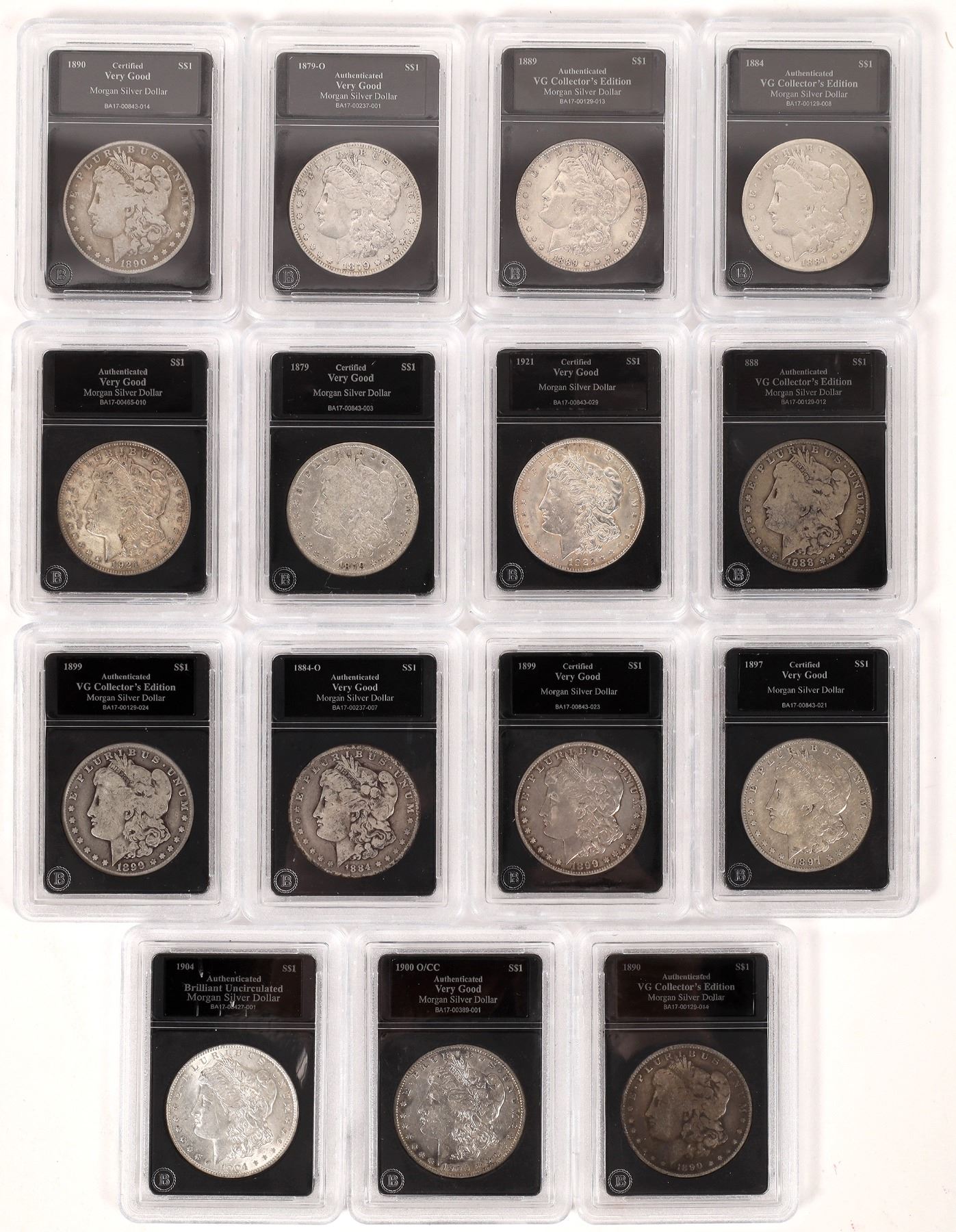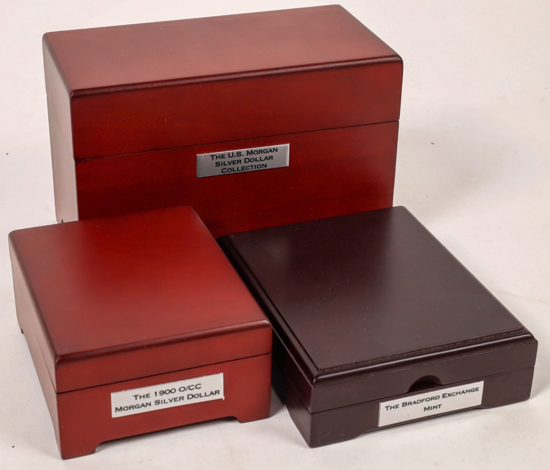 Issued by Bradford Exchange Mint: three wooden boxes featuring Morgan silver dollars. 1) 1904 Authenticated Brilliant Uncirculated Morgan dollar, slabbed by Bradford. Wooden case is 4 x 5 x 2 inches. 2) The 1900 O/CC Morgan Silver Dollar, authenticated very good condition, with certificate of authenticity. Case is 4 x 5 x 2 inches. 3) The U. S. Morgan Silver Dollar Collection: 13 Morgan silver dollars authenticated very good condition, in a wooden case 7 x 3 1/2 x 5 inches.